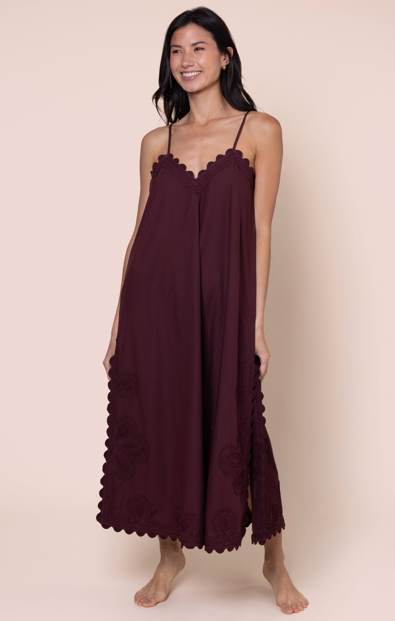 Poplin Midi Slip Dress in Black Cherry with Ric Rac Embroidery