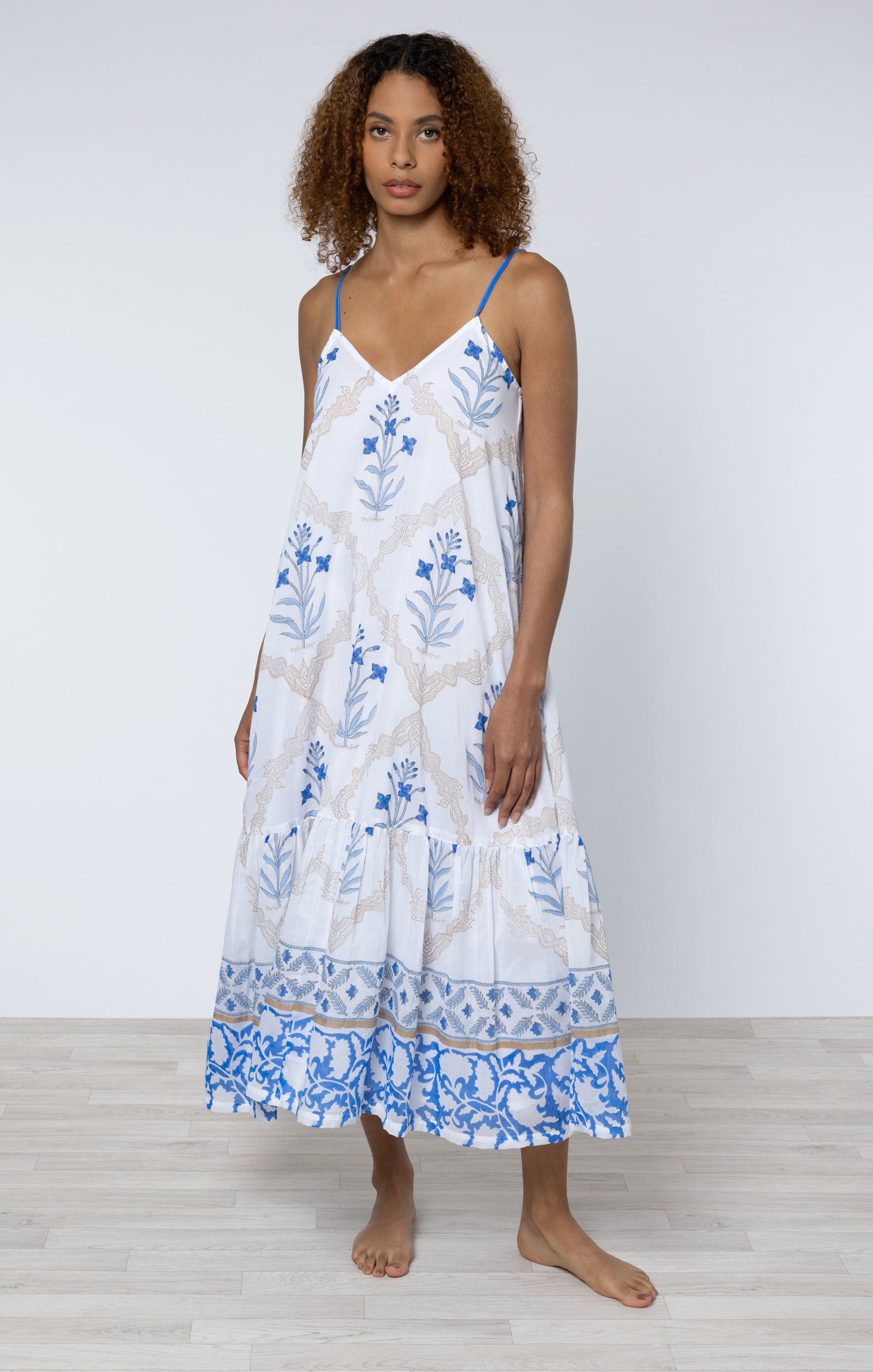 V Neck Midi Dress in Pale Blue Nomad Print