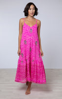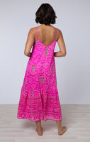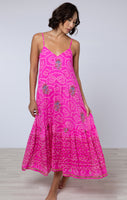 We've recreated this intricate design from our Juliet Dunn archives. Silk is screen printed with a white pattern before being hand block printed and finished with delicate sequin embroidery. Truly special, this dress is designed with cocktail parties in mind!