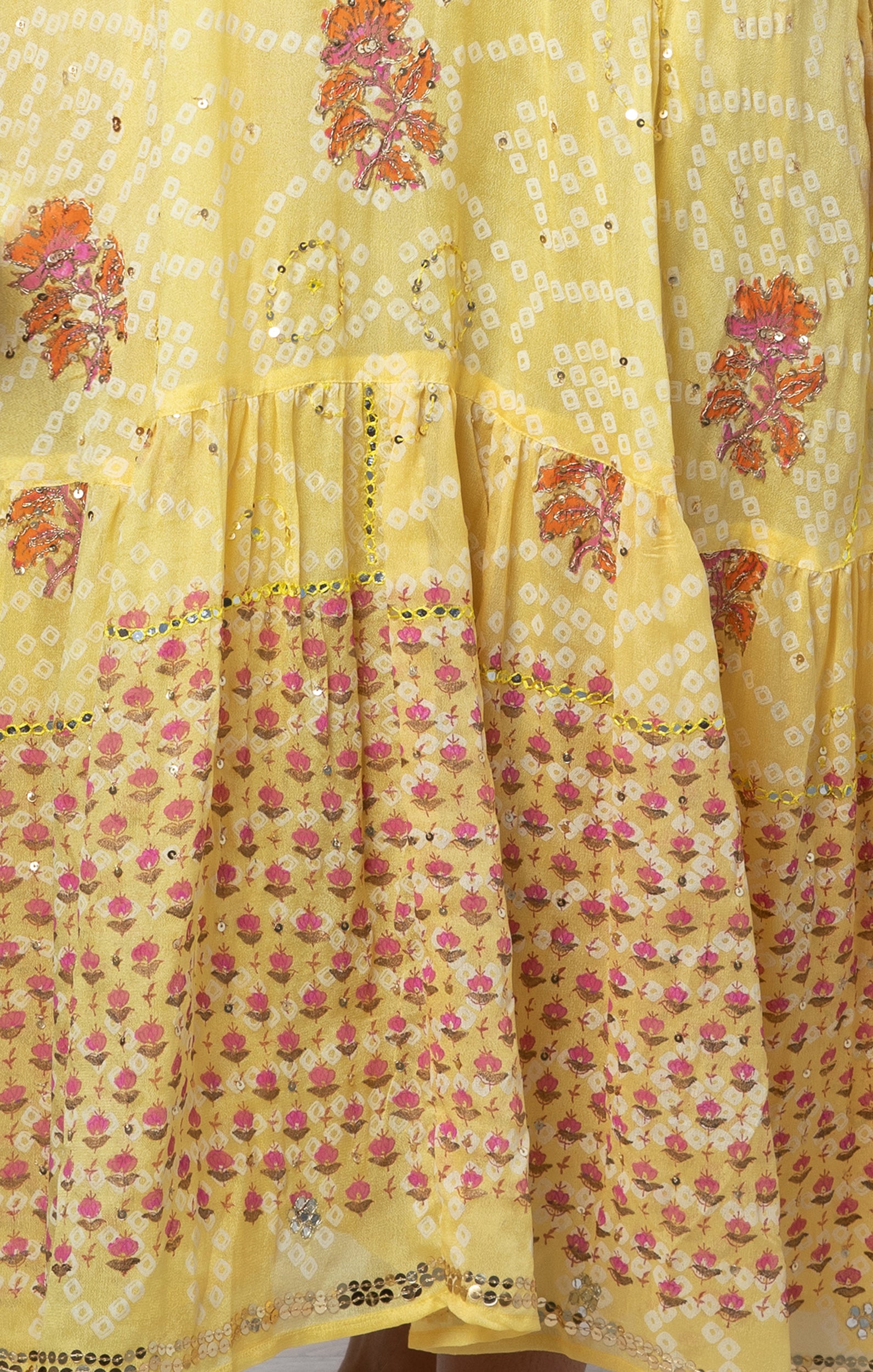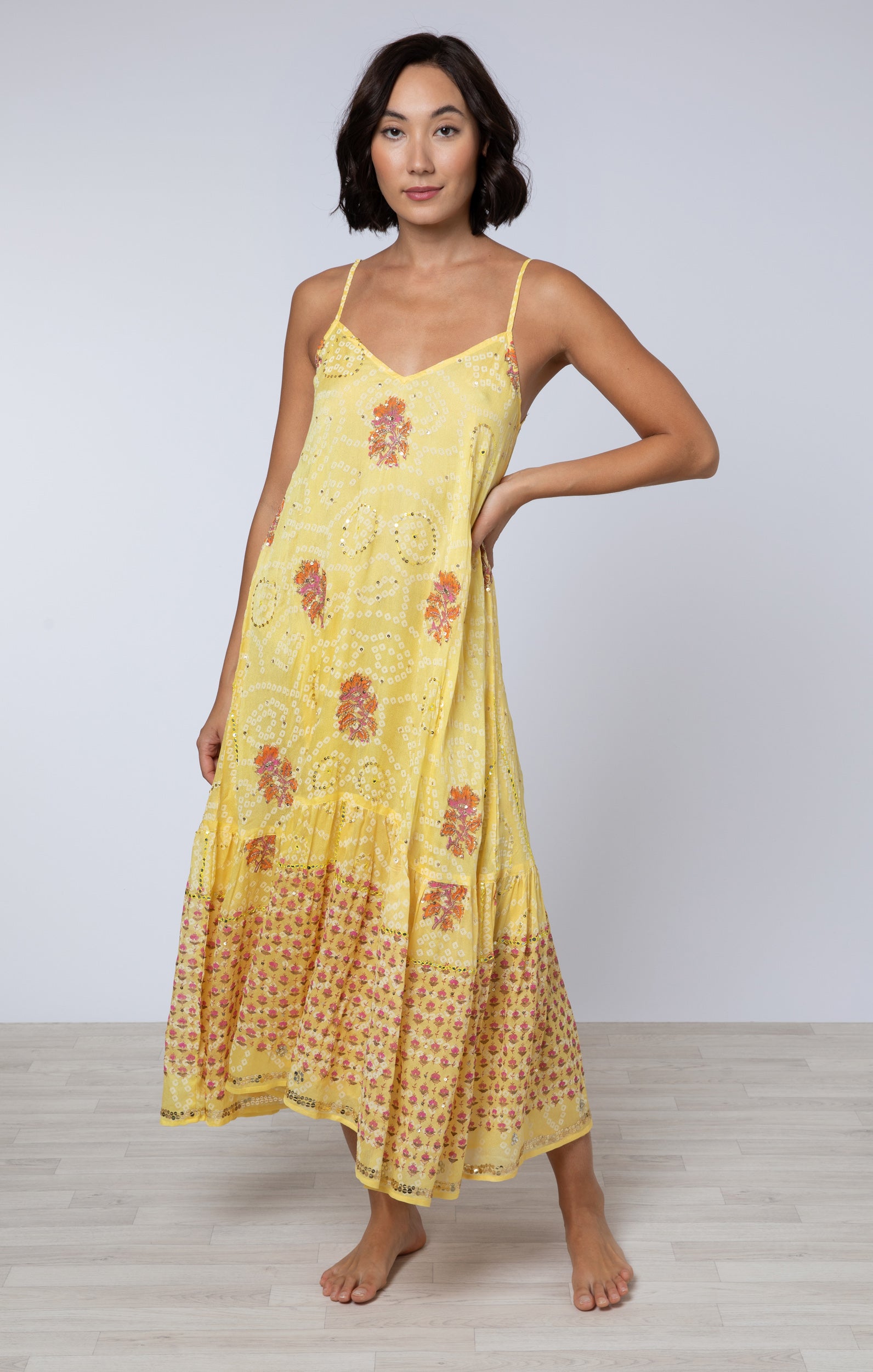 This silk midi dress features hand block printed florals which are accentuated with gold sequin embroidery. An elevated classic, this bright midi will turn heads. Recreated exclusively for our website from the Juliet Dunn archives, this fabric is truly special and full of intricate detail.