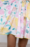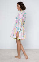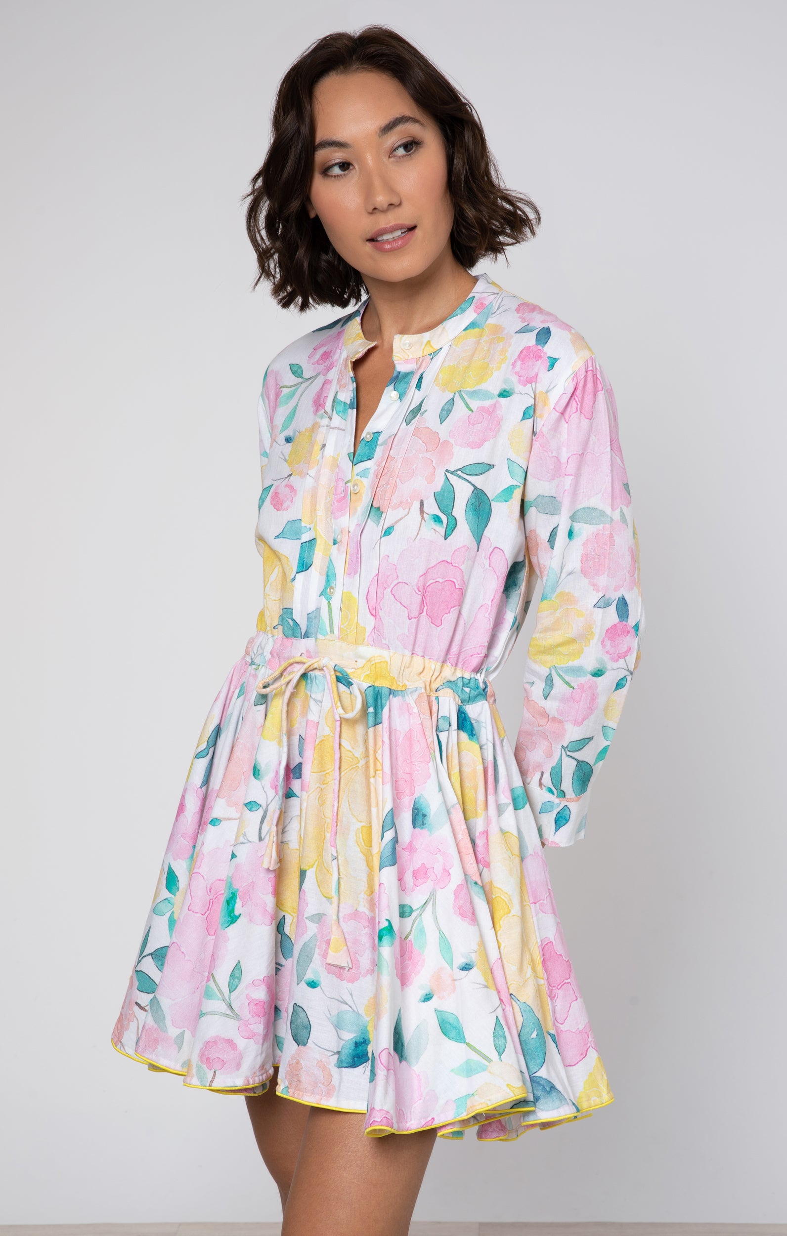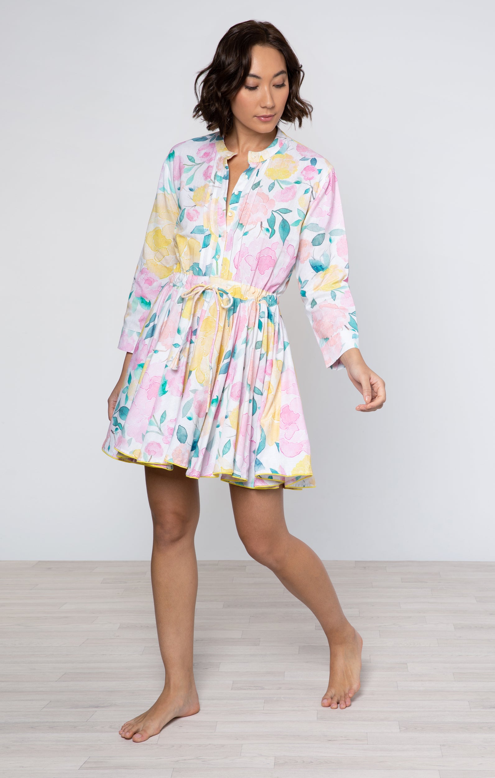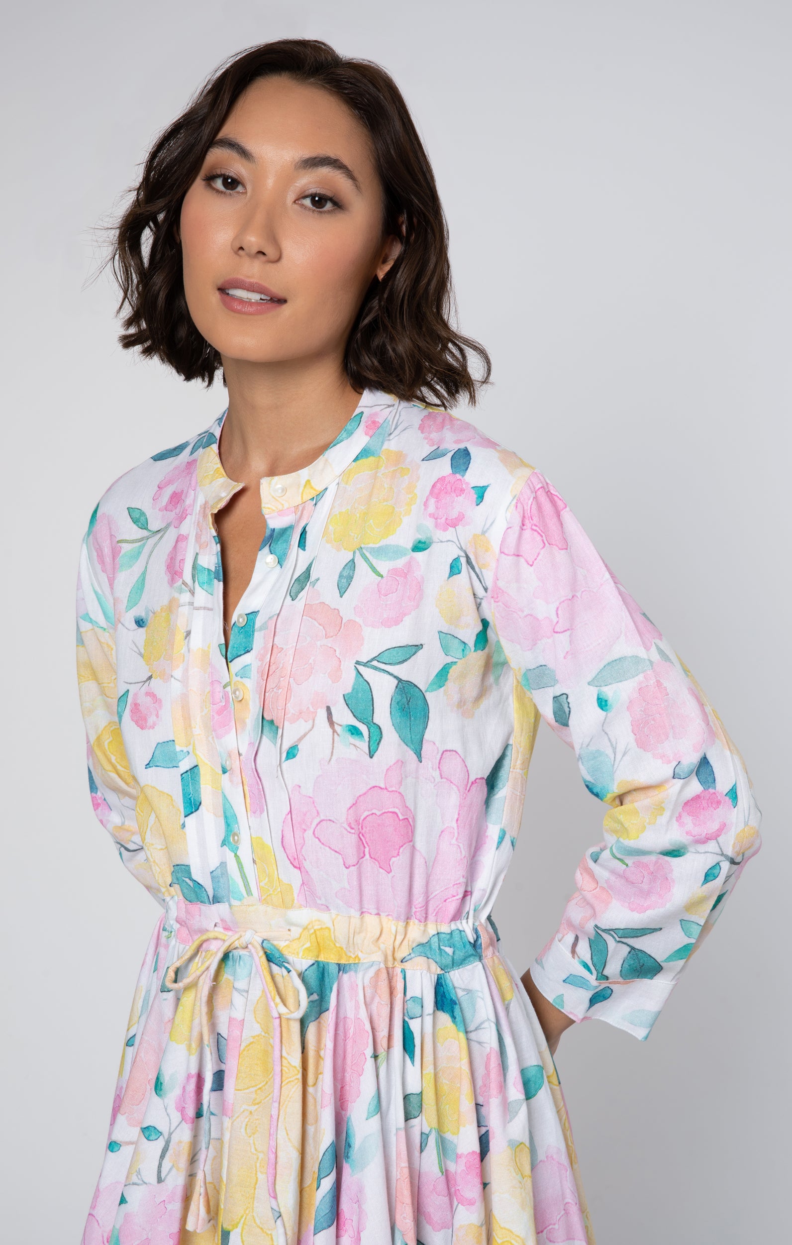 This button down dress features a drawstring waist and a full, flared skirt. White cotton/linen blend fabric is hand printed with a beautiful floral design. Let peonies adorn your body with these beautiful blooms