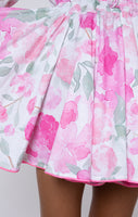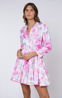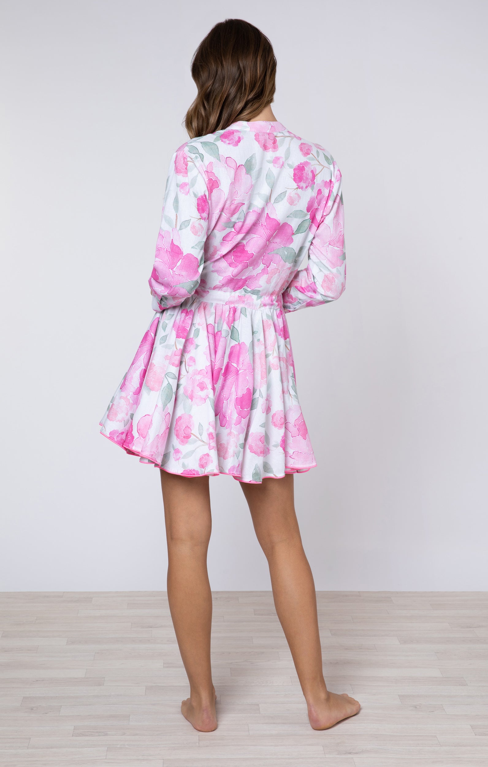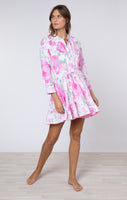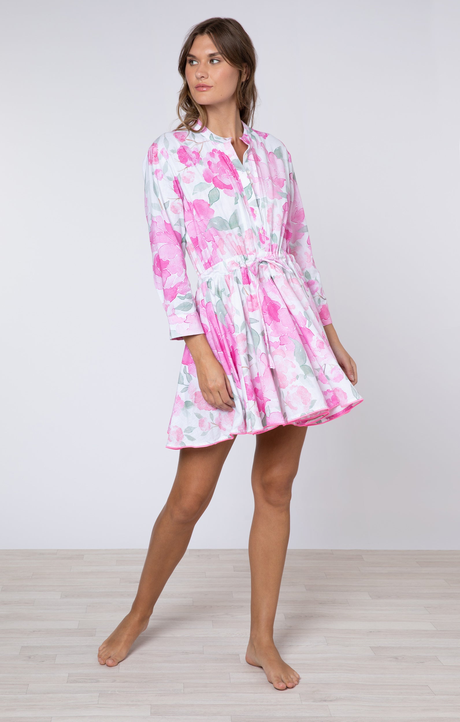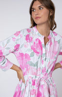 This button down dress features a drawstring waist and a full, flared skirt. This breezy linen-blend fabric is hand printed with a beautiful pink floral design. Let peonies adorn your body with these beautiful blooms