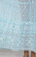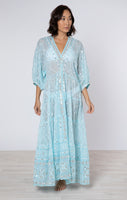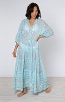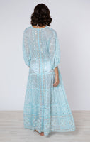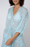 Emphasize your sun-kissed glow in this soft blue shade adorned with metallic mirror embellishments. Crafted entirely by hand with a printed and embroidered design, this stand out cover-up requires no additional adornments. Ideal for wearing over a simple bikini, or layer with a slip dress for a chic evening ensemble.