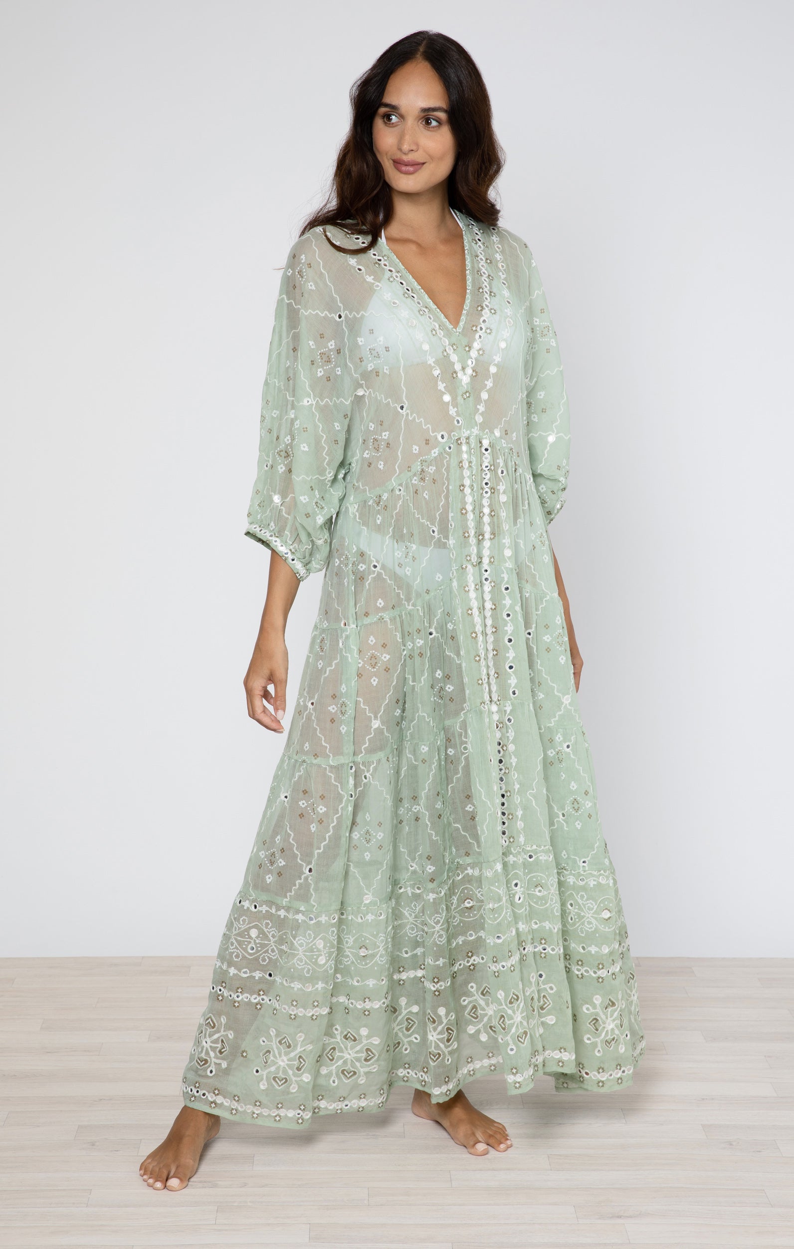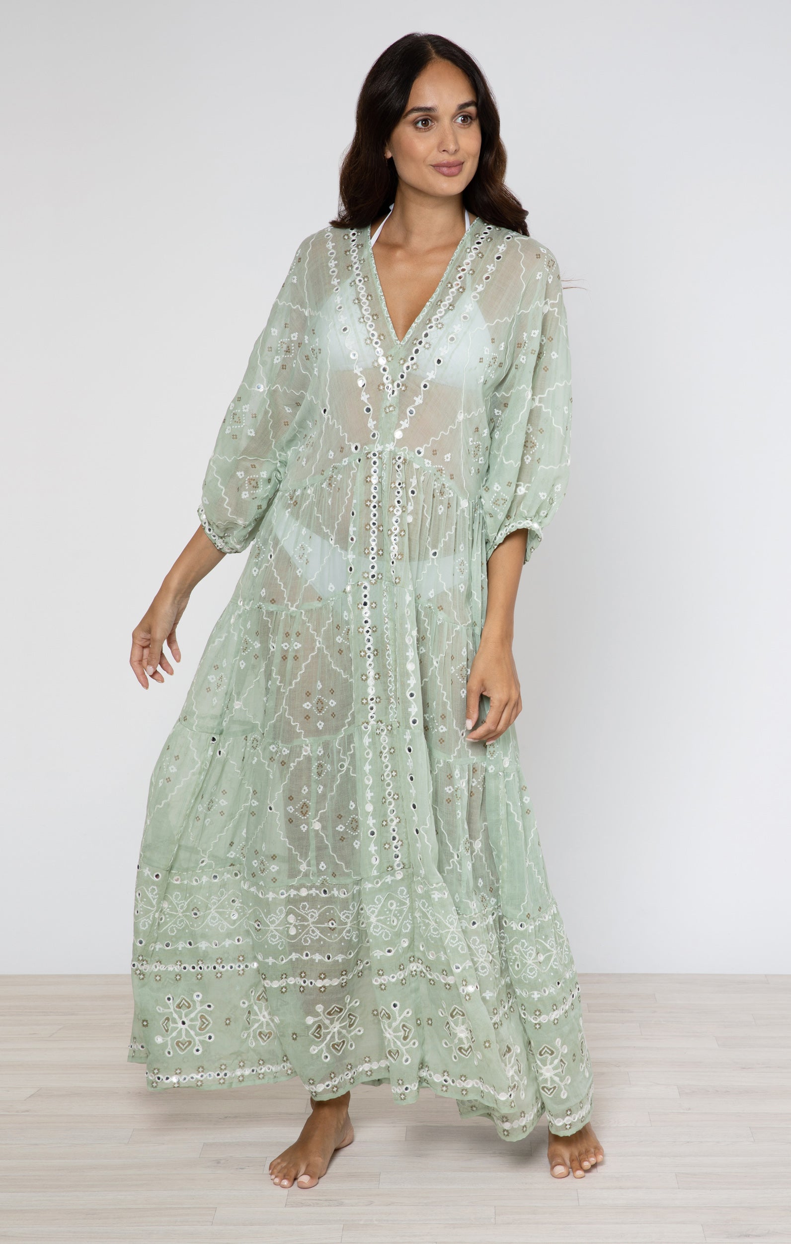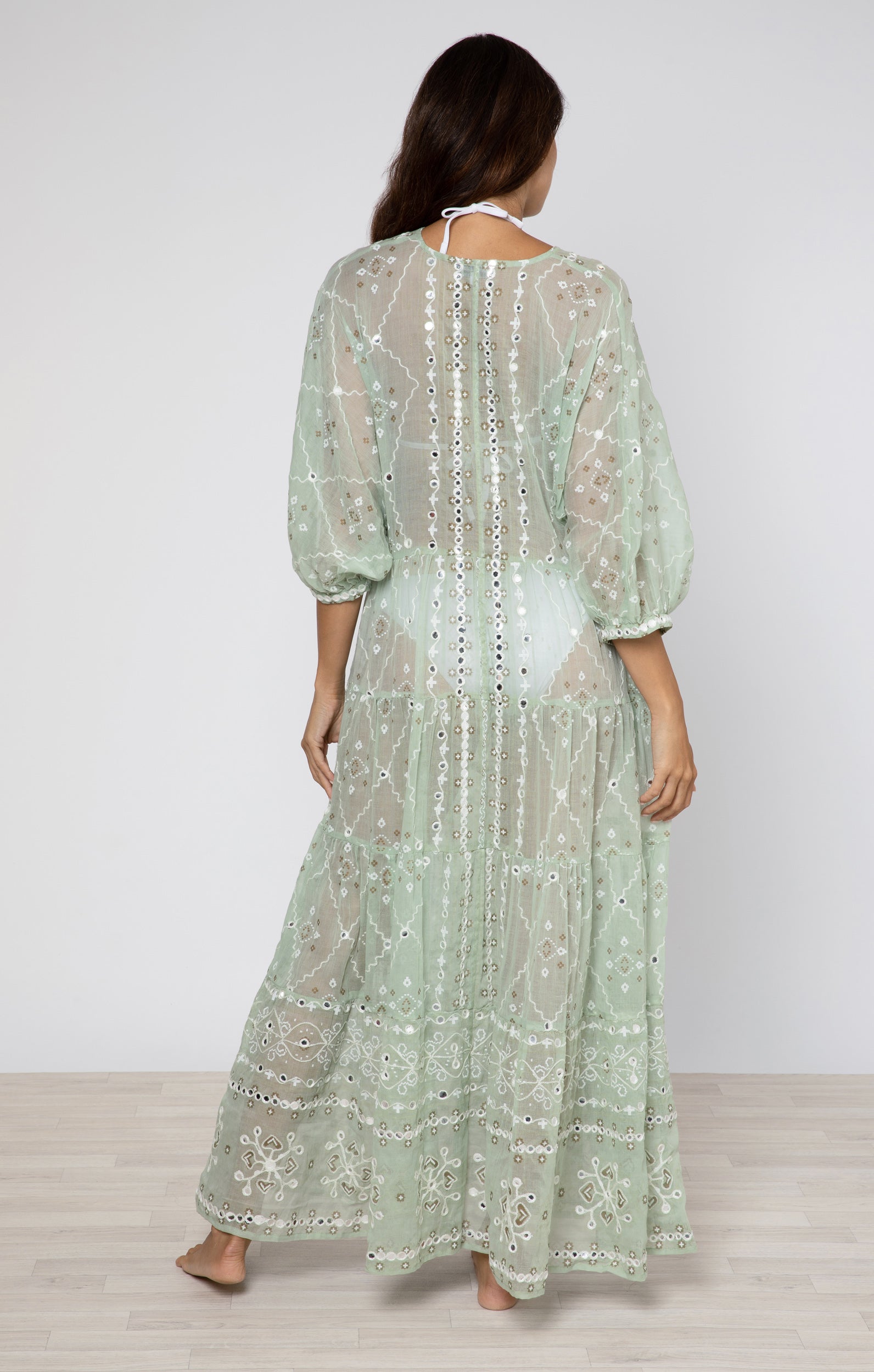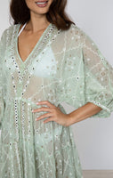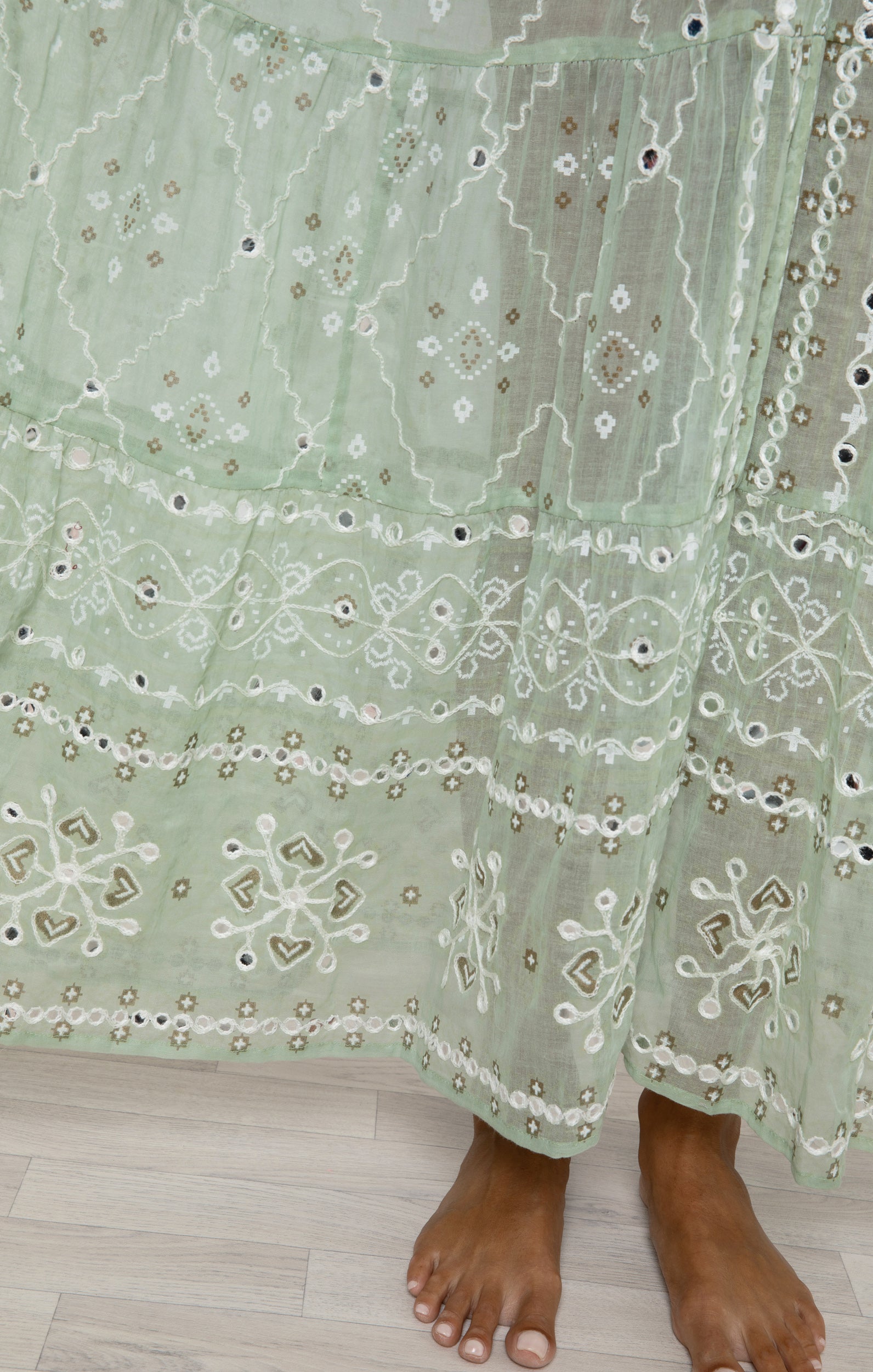 Add a touch of shine to your naturally radiant complexion with this charming sage green maxi dress. Handcrafted with a unique print and delicate embroidery, featuring playful metallic mirror details. This standout piece needs no extra accessories.