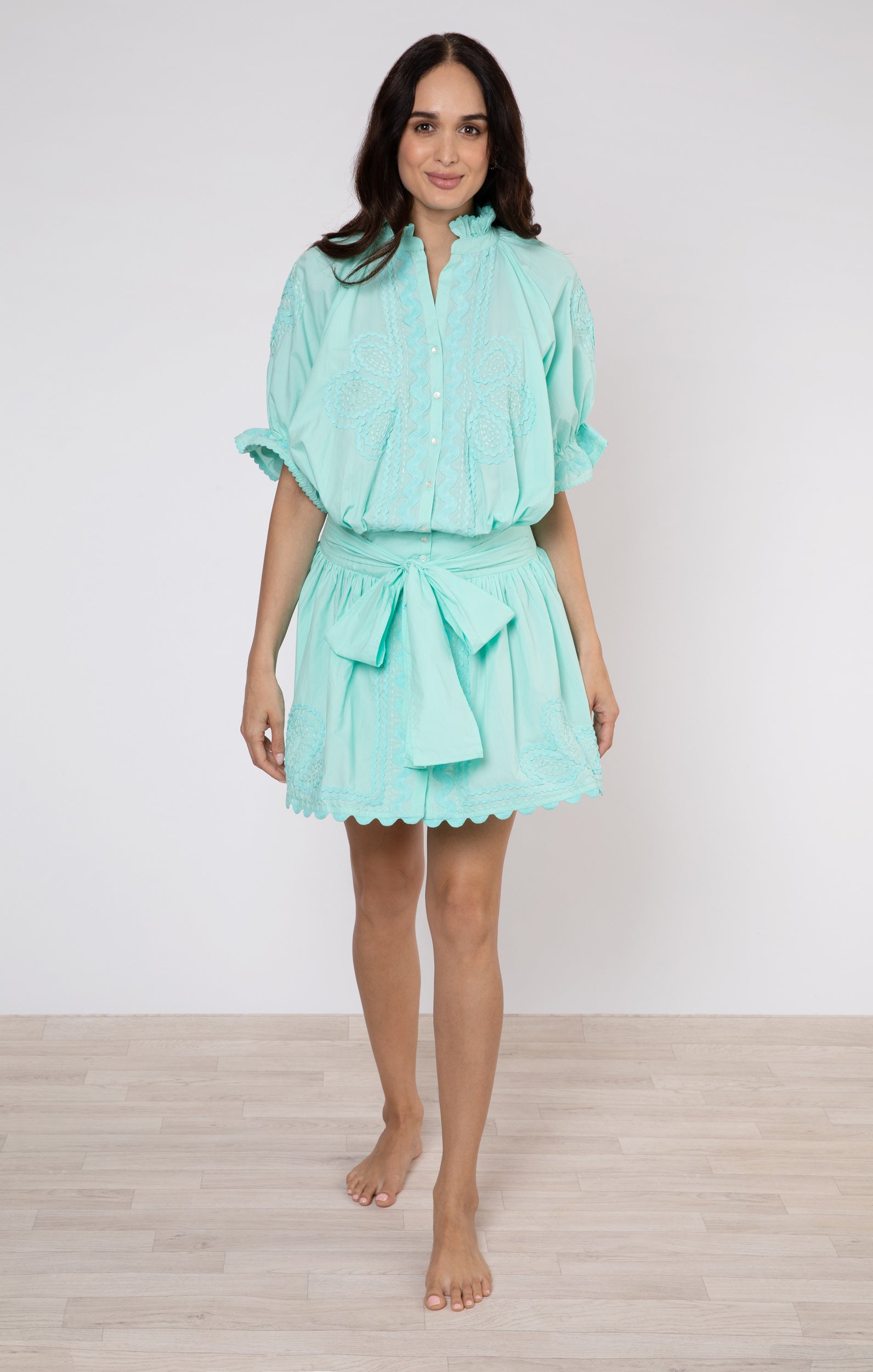 Machine wash at 30 degrees or lower. The nature of the ric rac finishing means these pieces need to be treated delicately to retain the quality of the garment. The pigment may fade over time with excessive sunshine or washing.