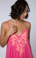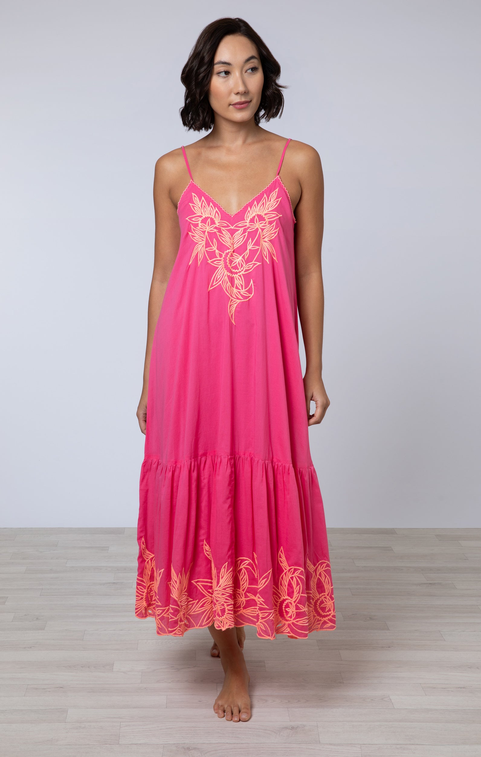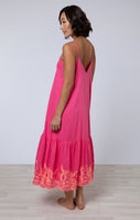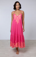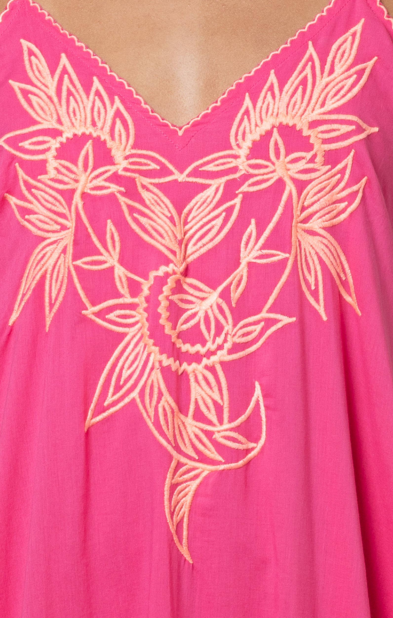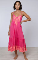 Fuchsia V Neck Midi Dress with Coral Embroidery