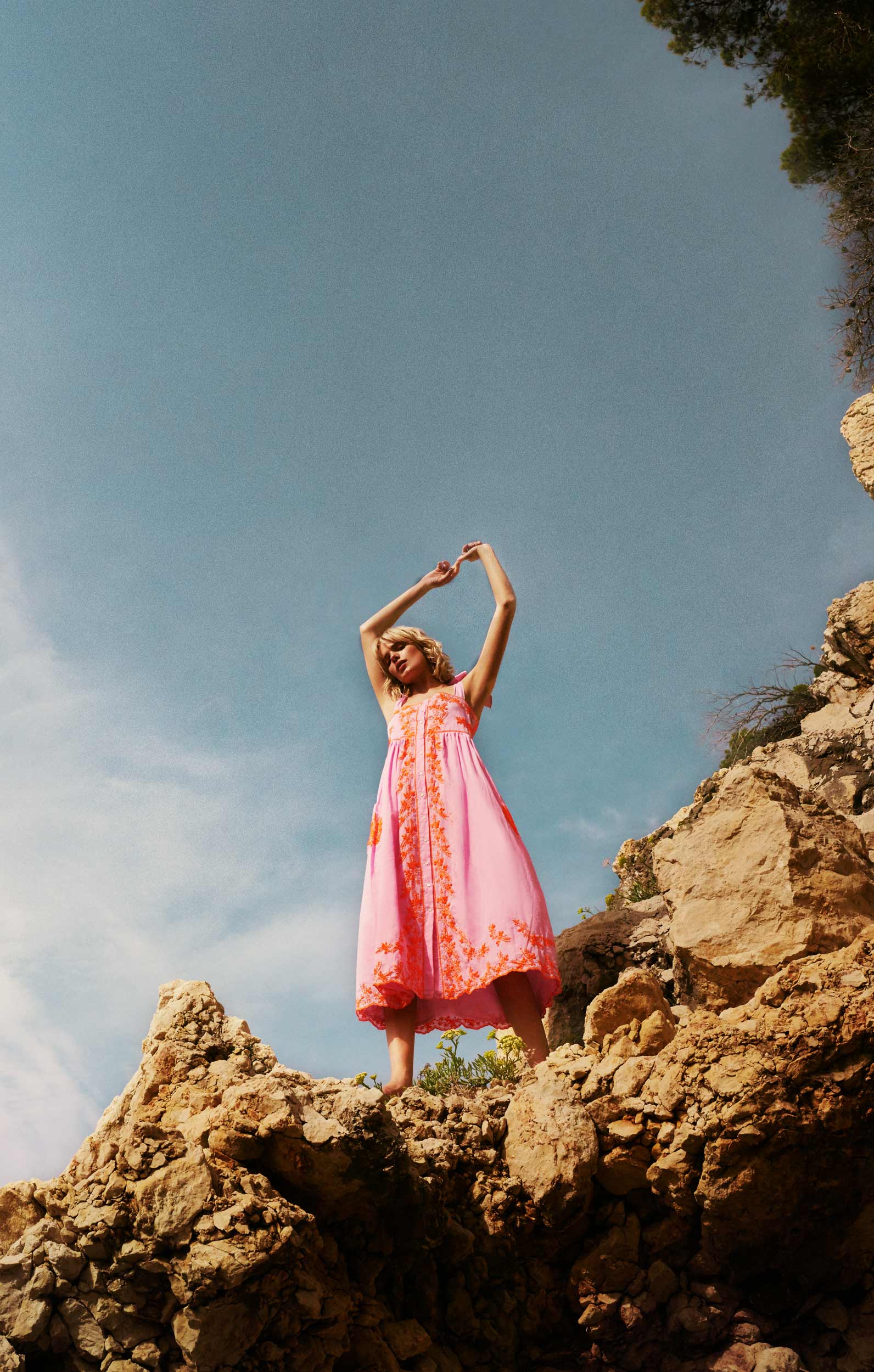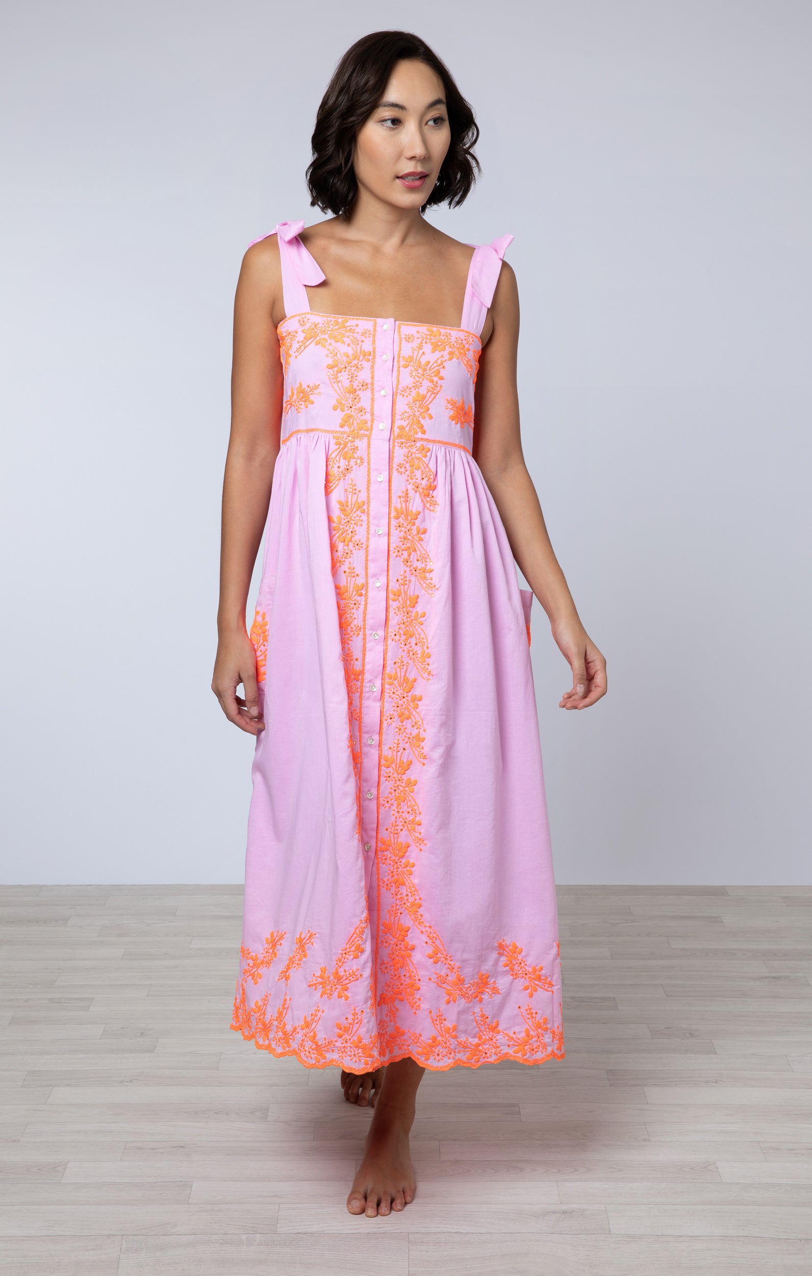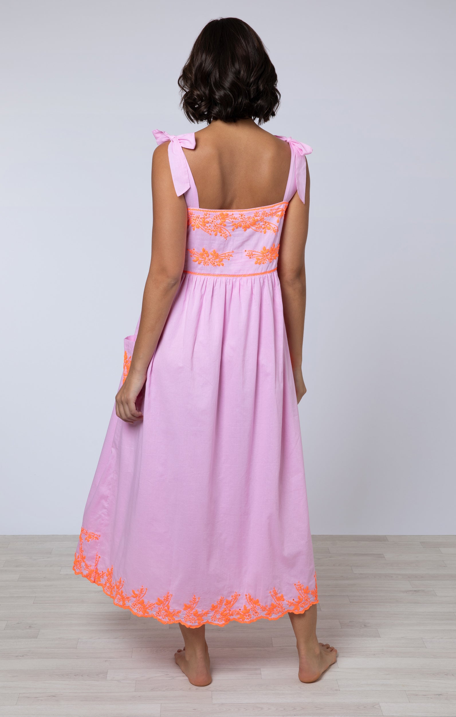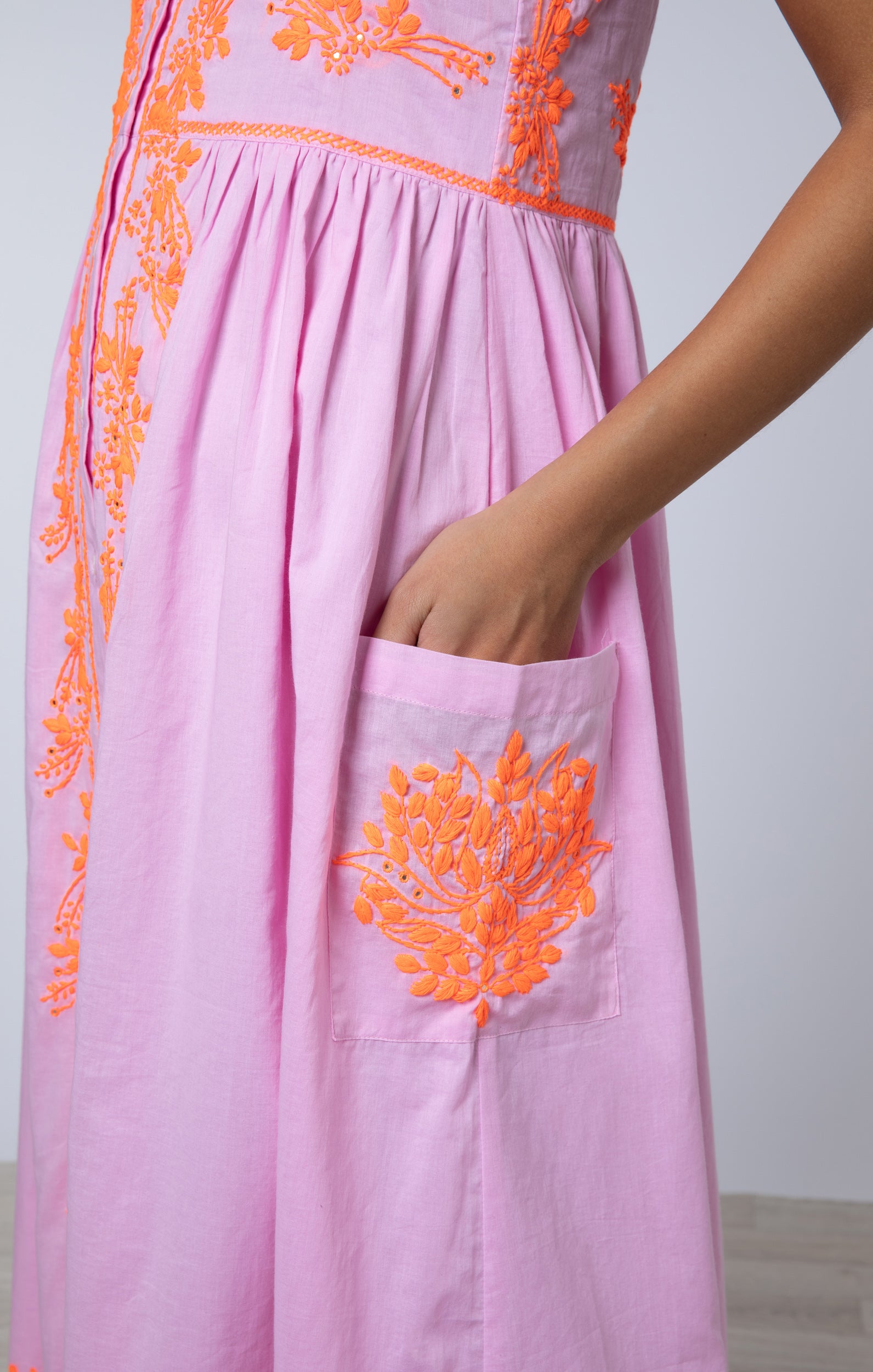 Pink Tie Shoulder Dress with Contrast Hand Embroidery