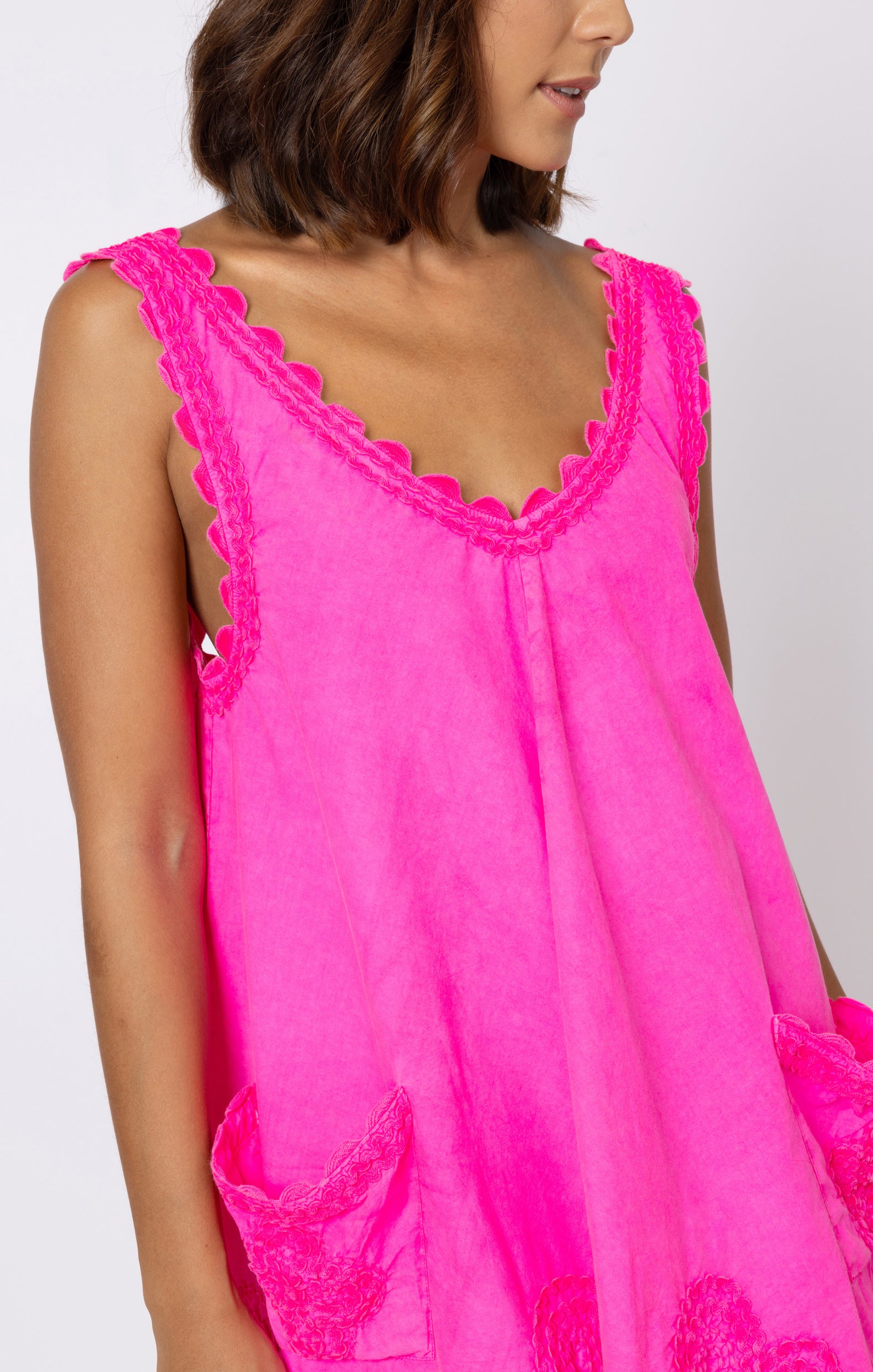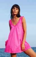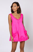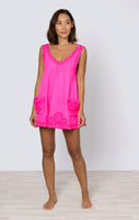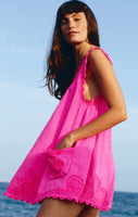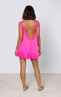Looking for a swimsuit cover up? Look no further than this easy to wear mini dress with a scooped low back. In a bright pink accentuates your golden glow, this dress is easy to pack and even easier to wear.