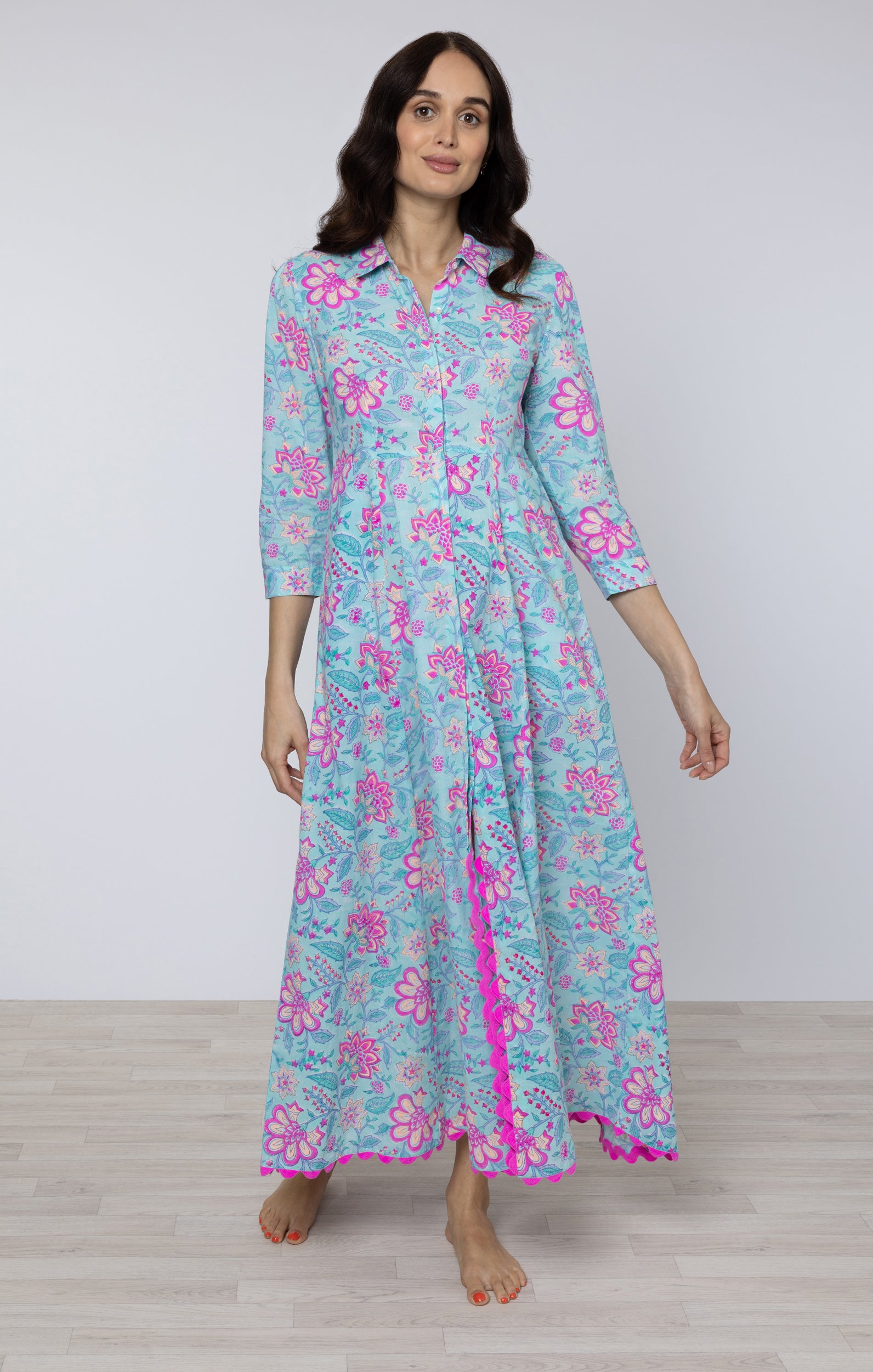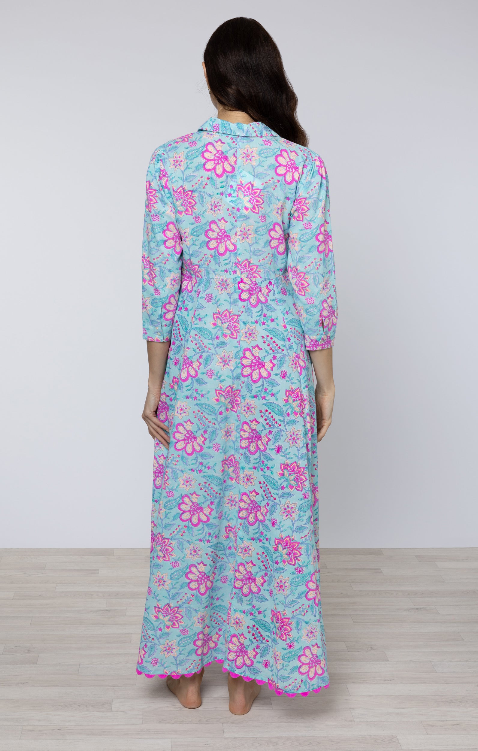Aqua Floral Print Maxi Shirt Dress