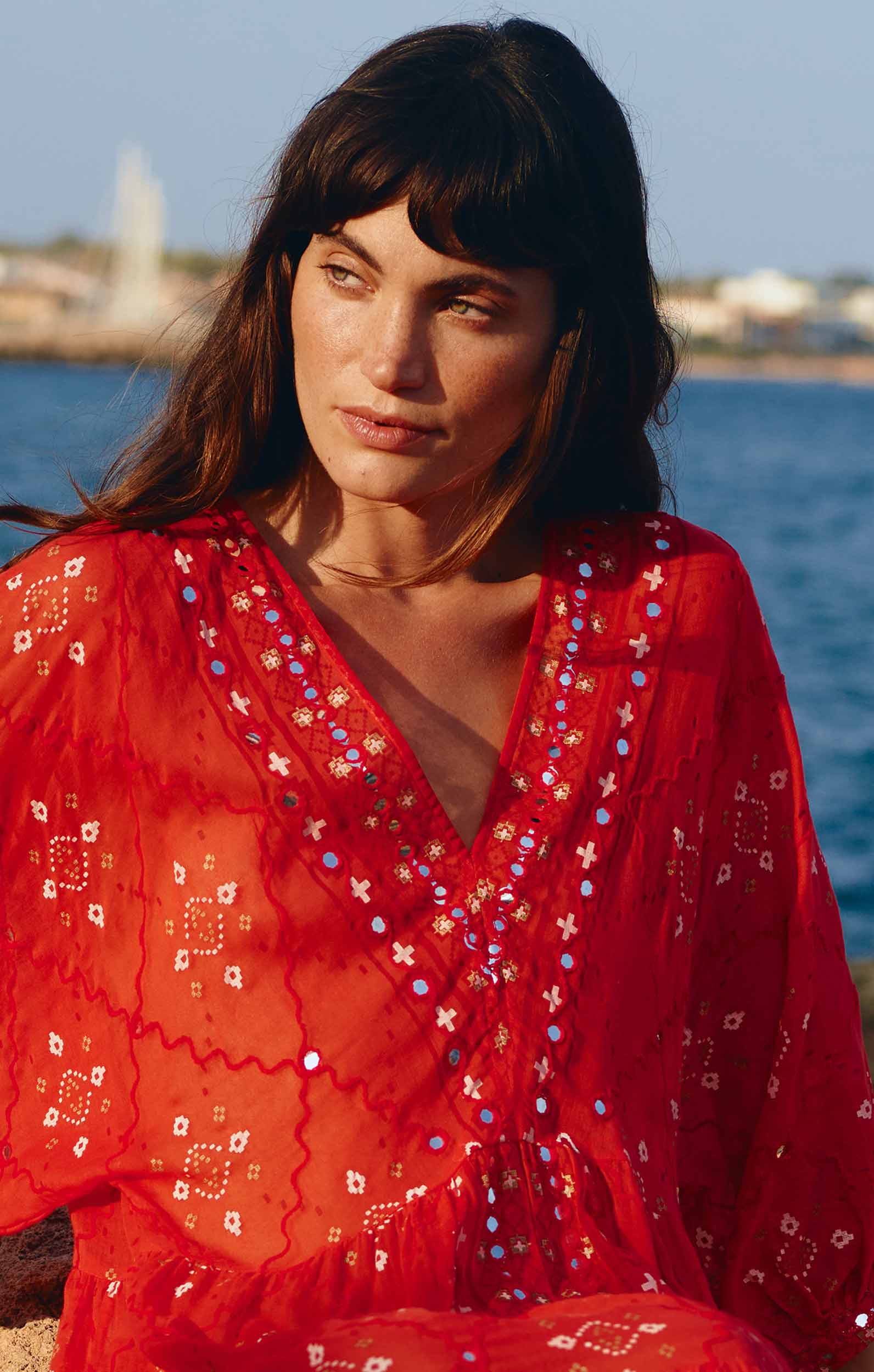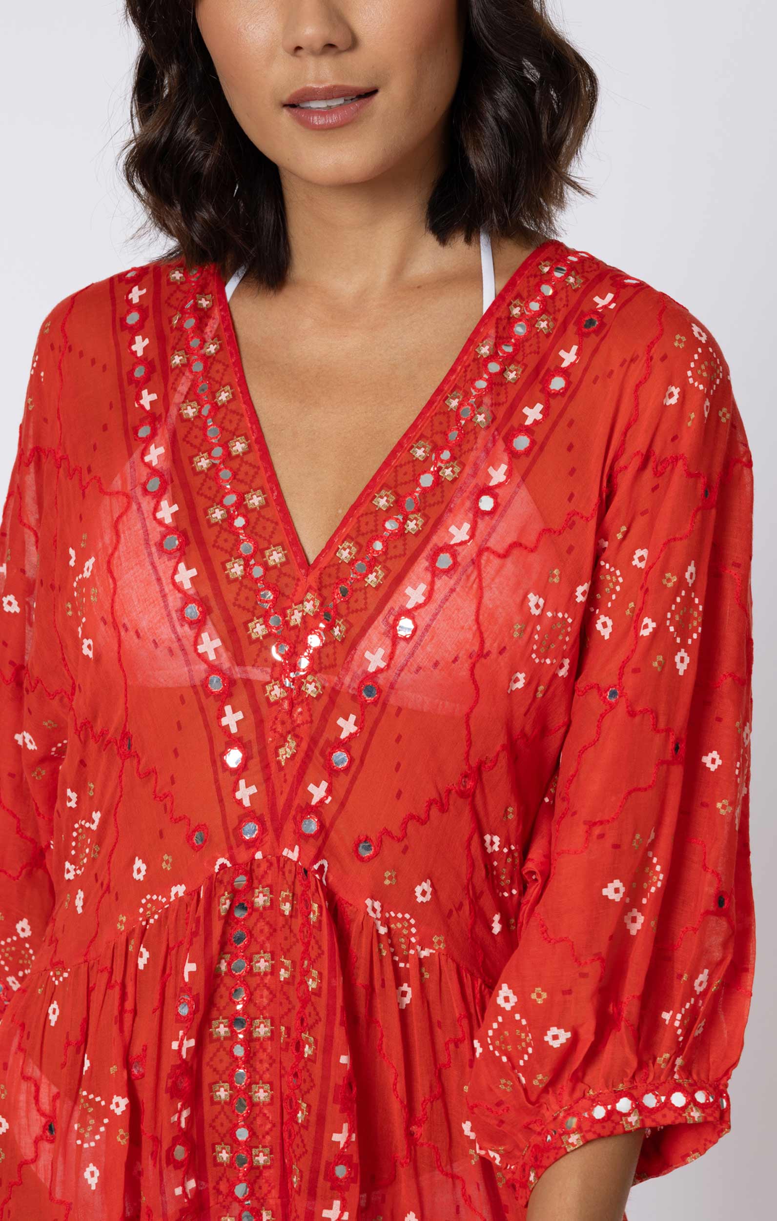 Hand printed with mirror details and embroidery, this stand-out maxi dress is designed to be shown off. Wear with a nude slip dress underneath for a dinner under the stars, or pair with your best bikini for the ultimate beach bar coverup.