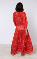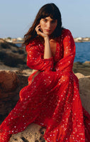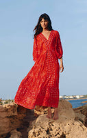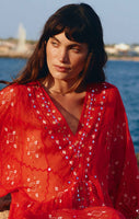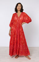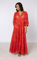 Hand printed with mirror details and embroidery, this stand-out maxi dress is designed to be shown off. Wear with a nude slip dress underneath for a dinner under the stars, or pair with your best bikini for the ultimate beach bar coverup.