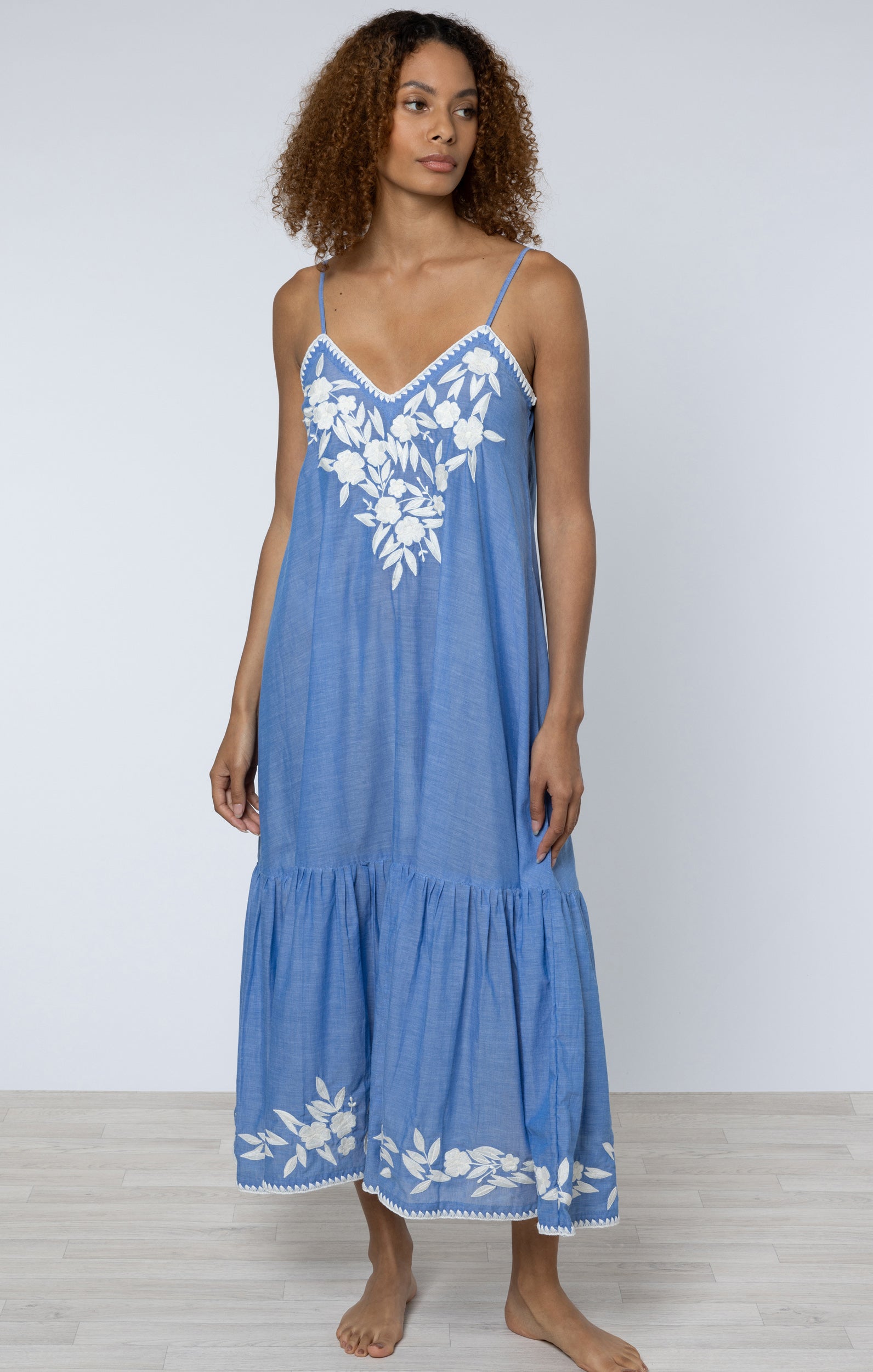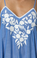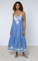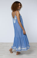 Denim Blue Chambray V Neck Midi Dress with Cream Embroidery
