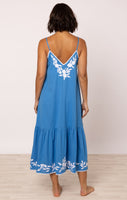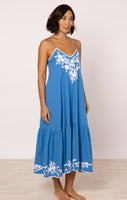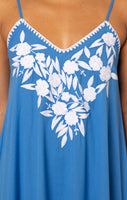 This bright blue dress will elevate your wardrobe with its crisp embroidery details.