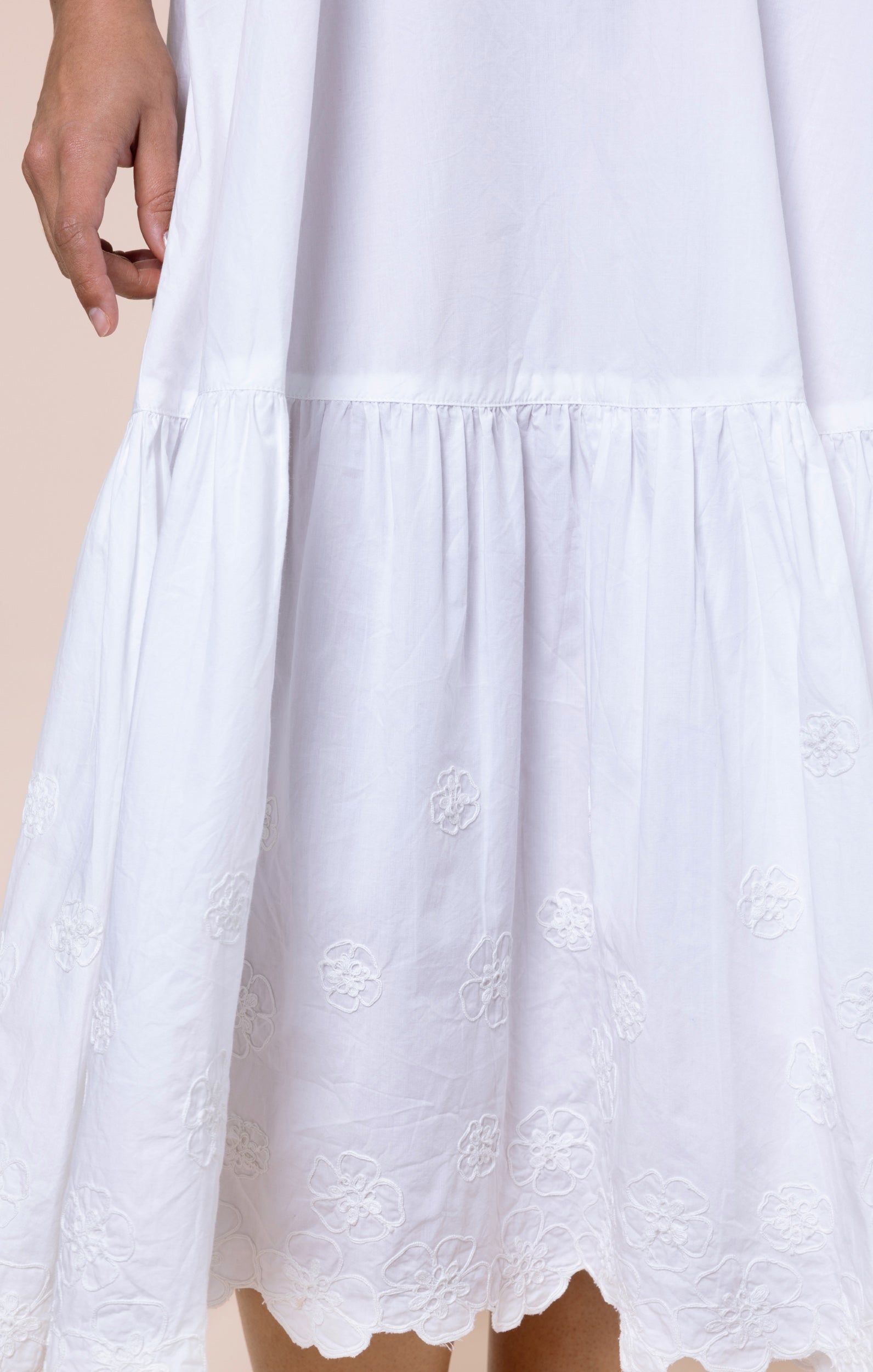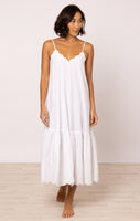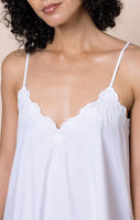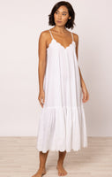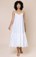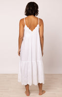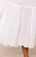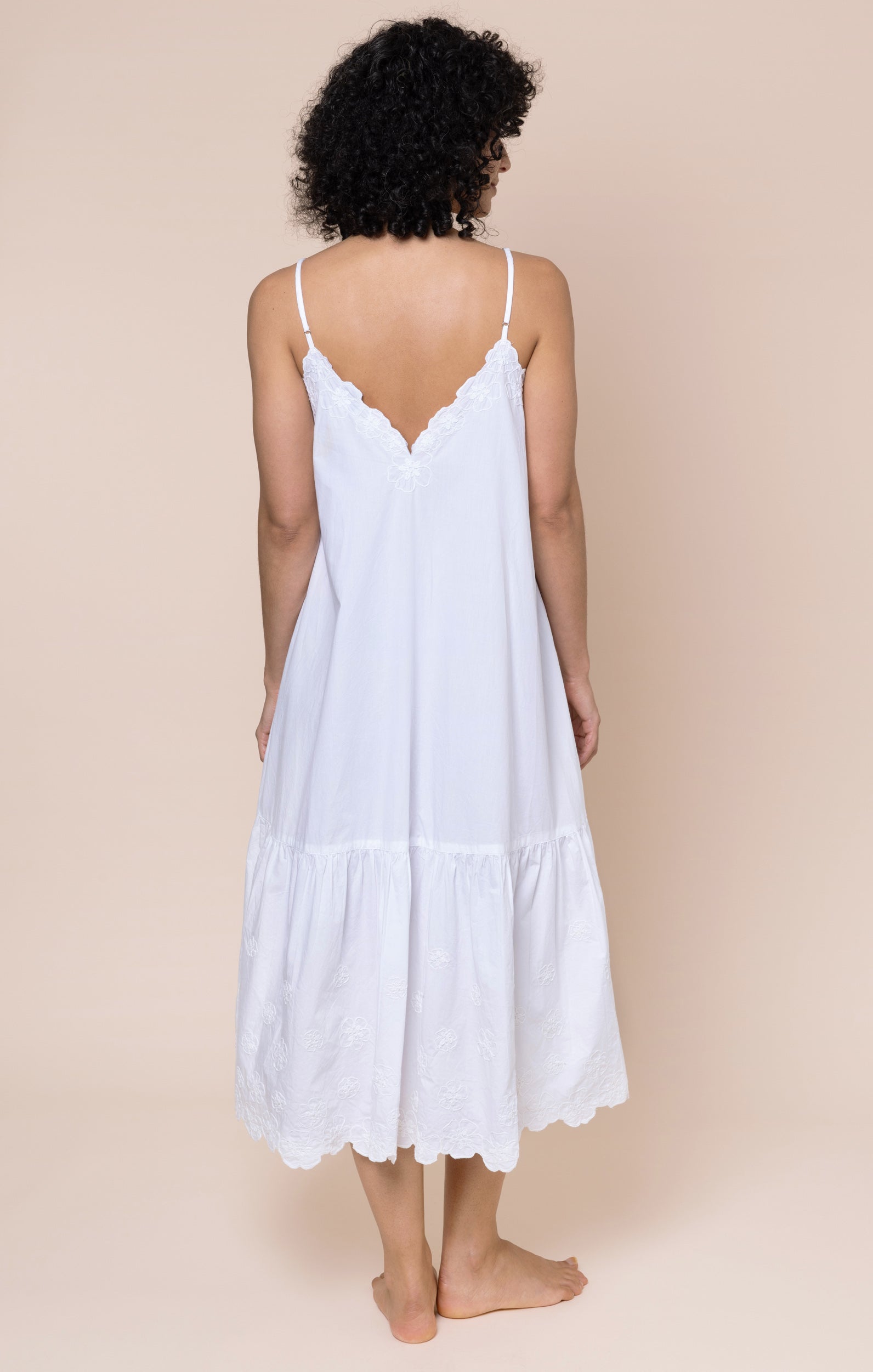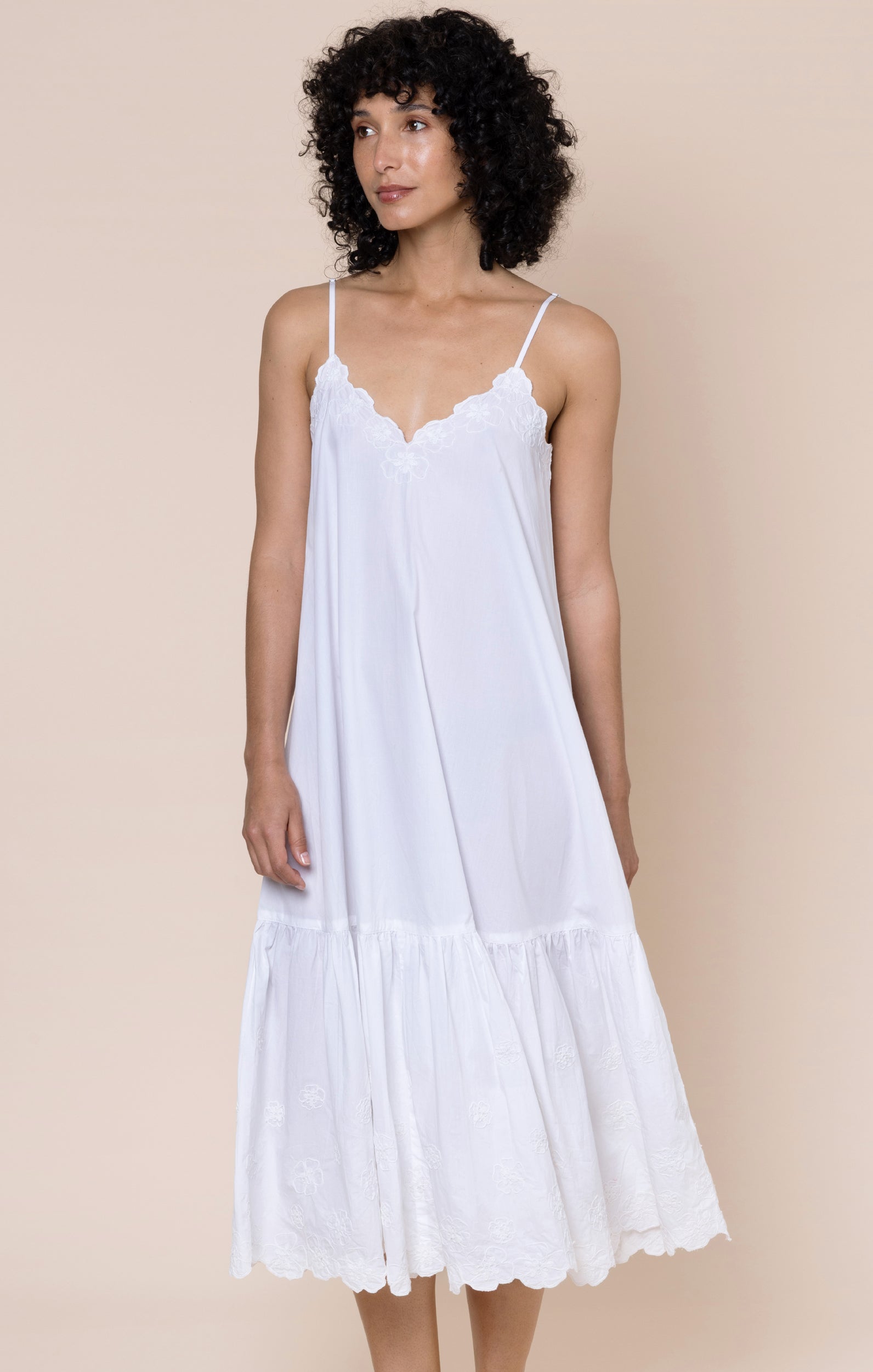 A pure white dress is a vacation must-have. The spaghetti straps are fully adjustable, creating a flattering V at both front and back of this dress which can be as deep as you choose. The delicate floral cord embroidery and scalloped detailing add a fun touch to a simple dress