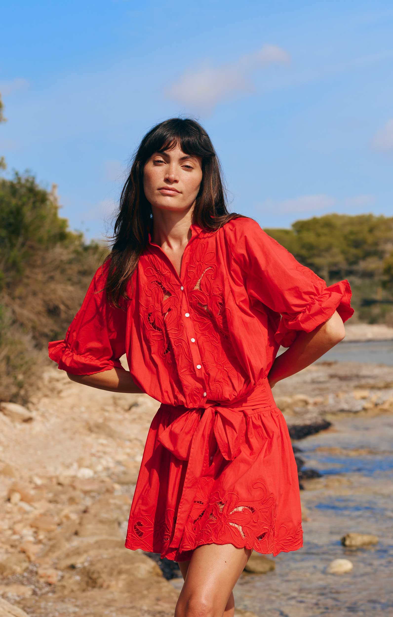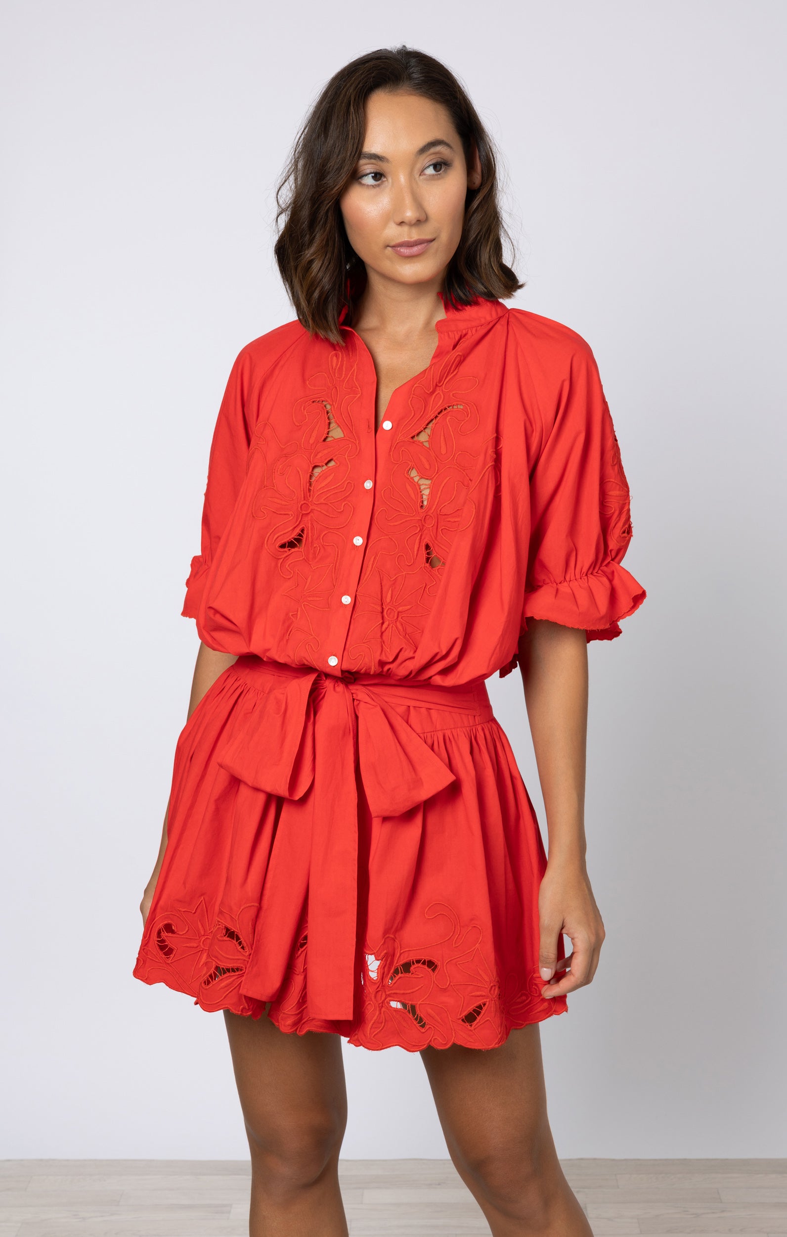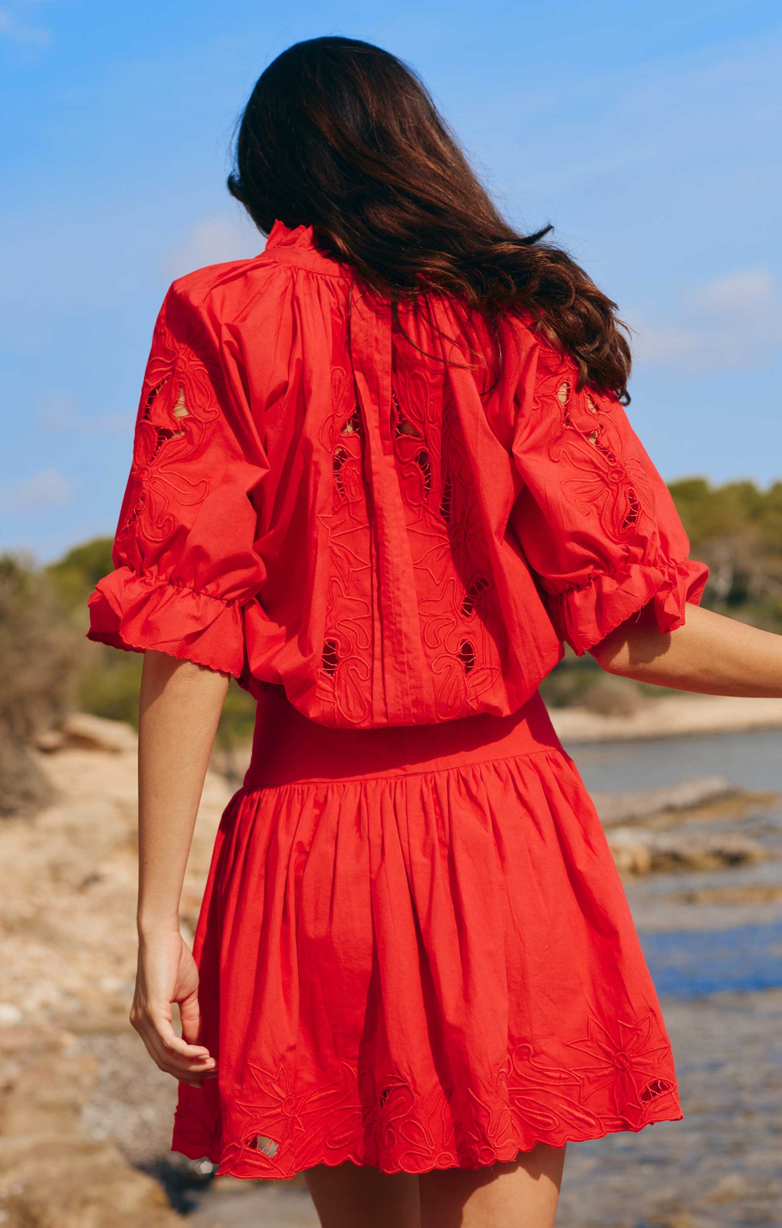 Red Poplin Blouson Dress with Cut Out Embroidery
