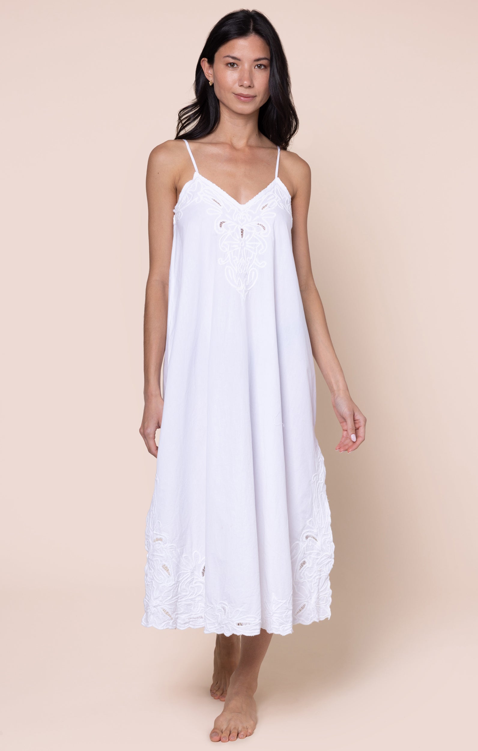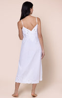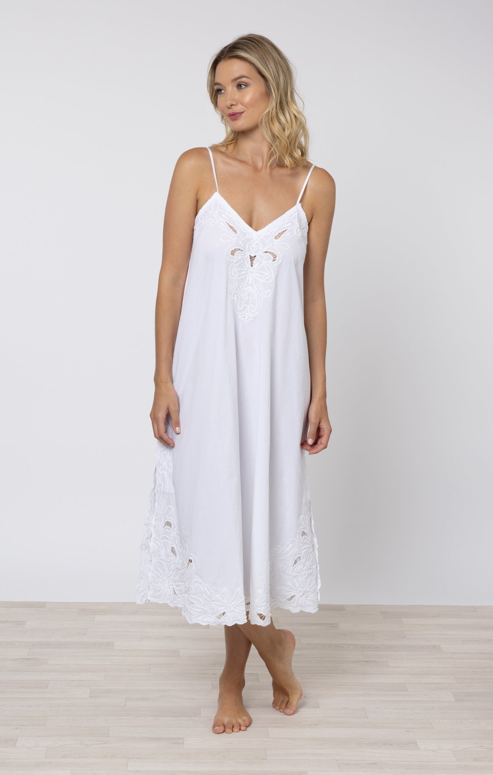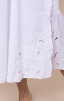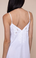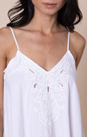 The cut-out embroidery detailing across the neckline and hem add a unique twist to this classic holiday piece. Perfect for girl's weekends, date nights, or mini breaks, this relaxed fit silhouette is flattering with its deep V neckline and large side slits.