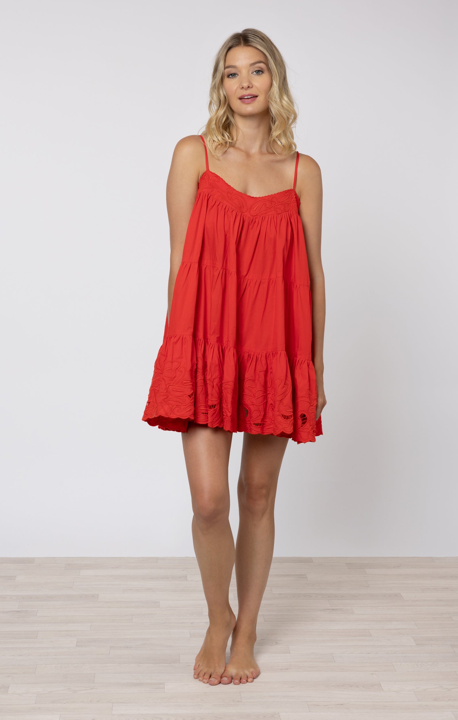 This vibrant mini dress is perfect for your next vacation. Cut out embroidered details - finished by hand - add depth and interest to this fun new shape. Adjustable spaghetti straps allow for the perfect placement of the wave neckline across your chest.