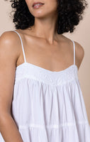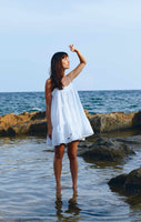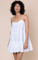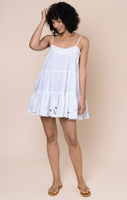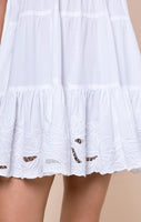 A white mini dress is a staple for any and every vacation. Cut out embroidered details - finished by hand - add depth and interest to this fun new mini shape. Adjustable spaghetti straps allow for the perfect placement of the wave neckline across your chest.