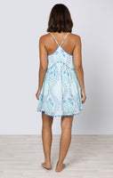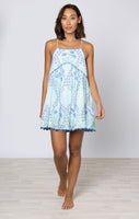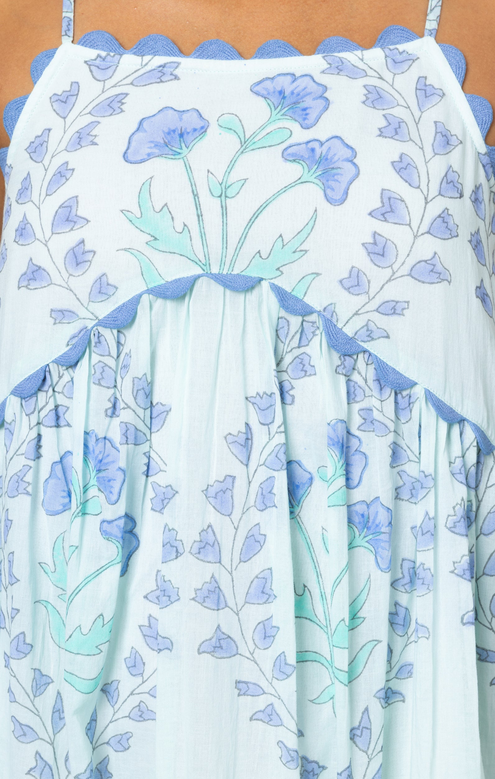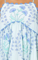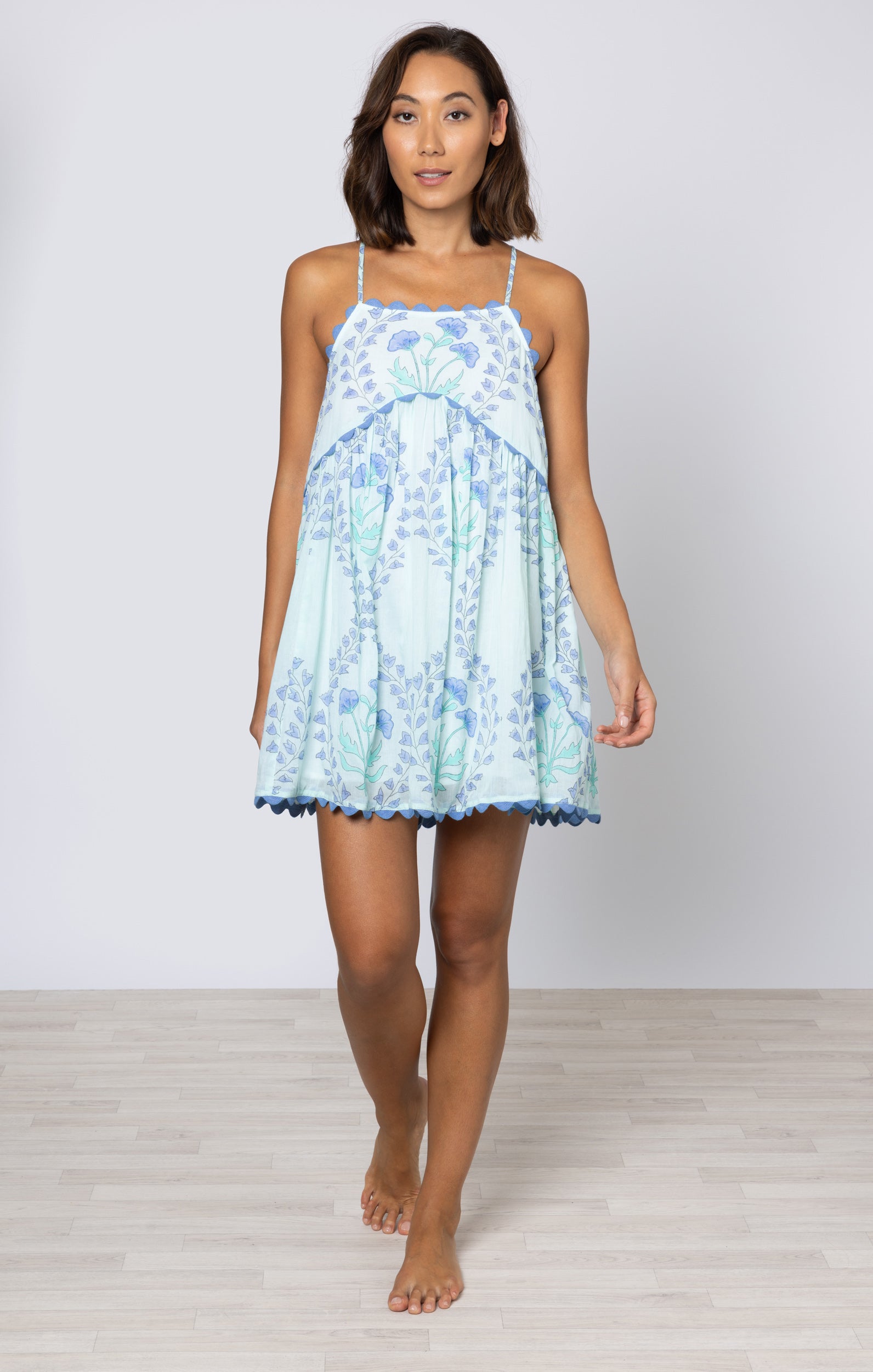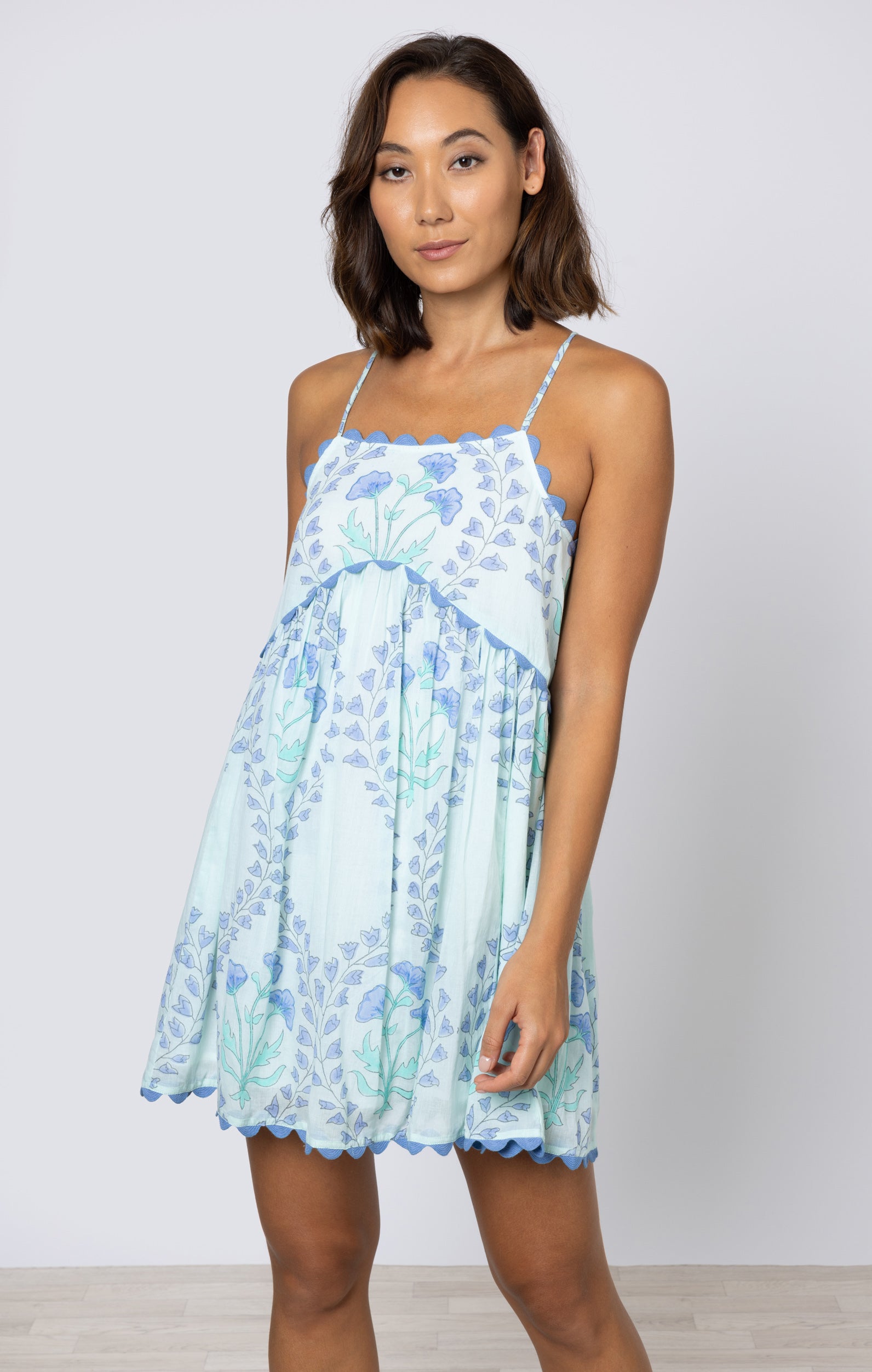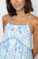 This unique floral print is perfect for summer sun and sandy beaches. The tight fit on the bust and loose short hemline make this dress both flirty and easy to wear. The hand blocked print is enhanced by ric rac details in a soft blue at the neckline and hem.