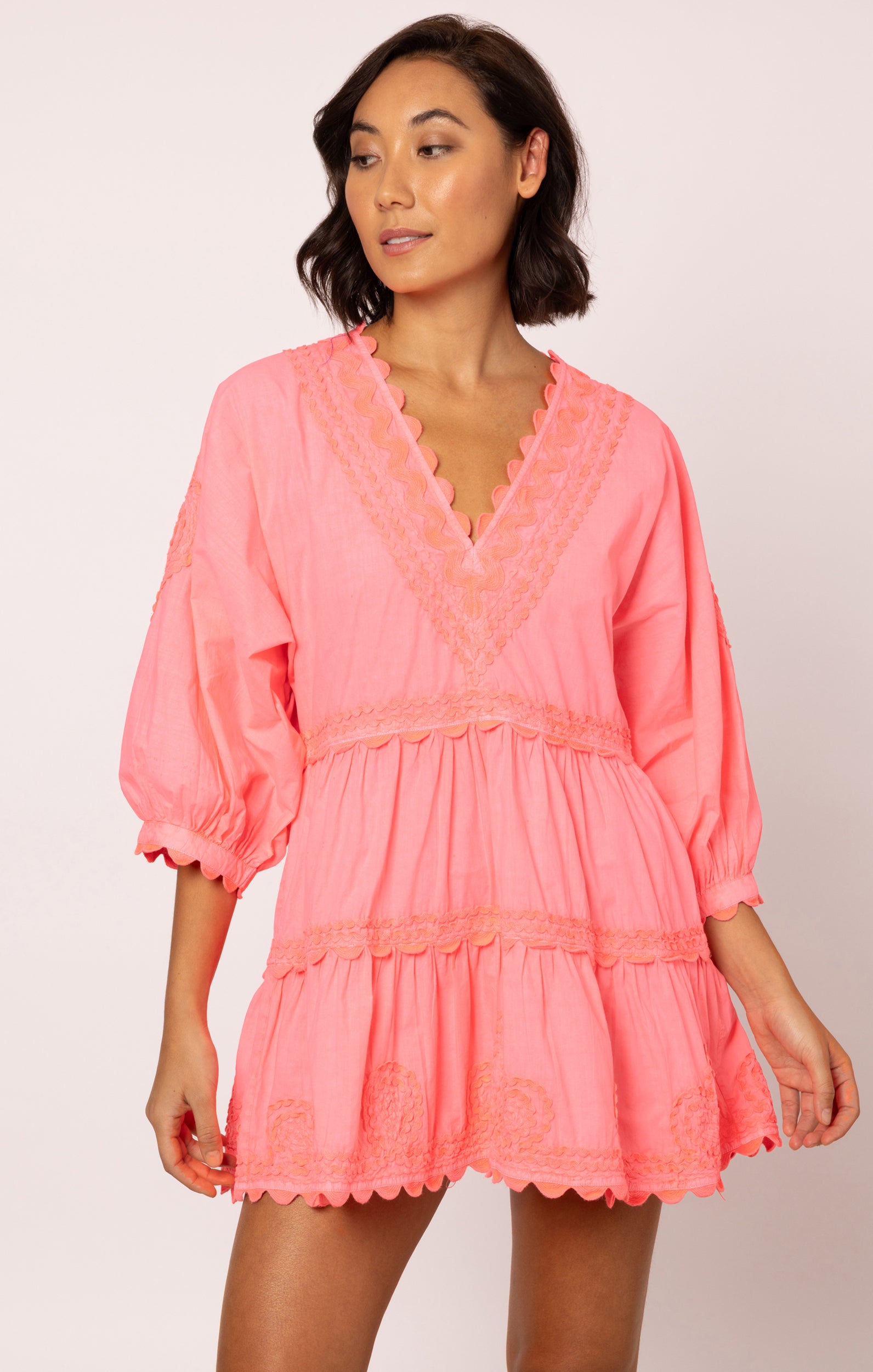 Loose Mini Dress in Watermelon Poplin with Ric Rac Embroidery