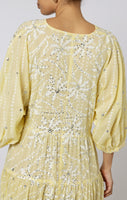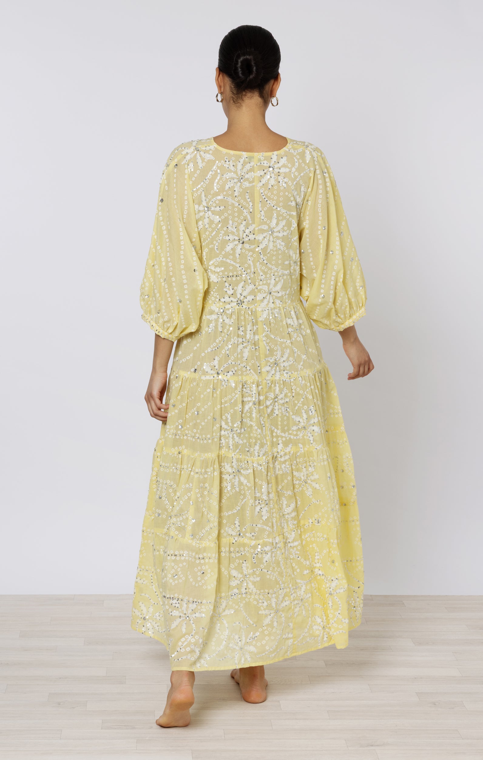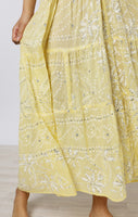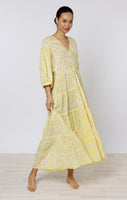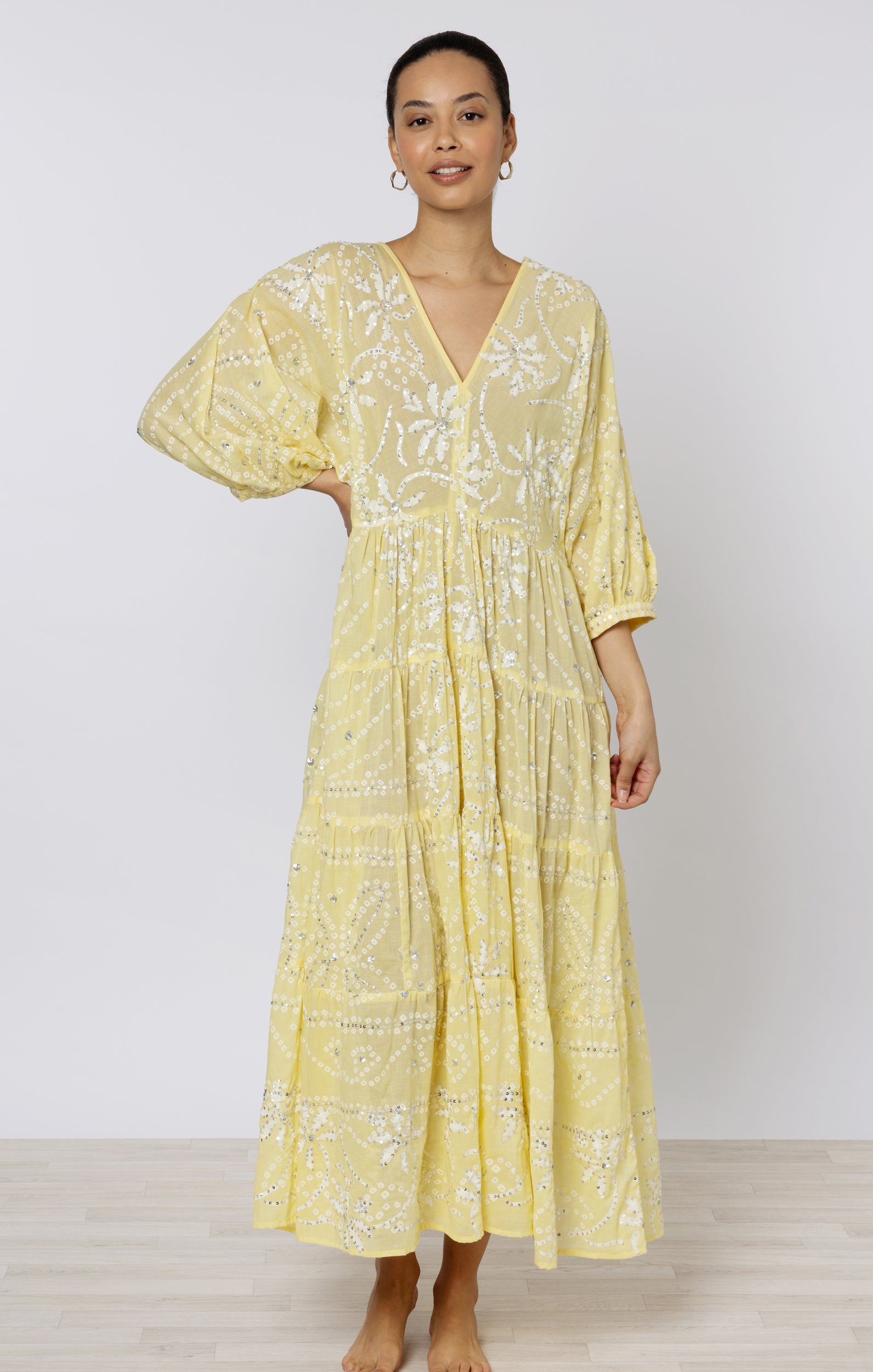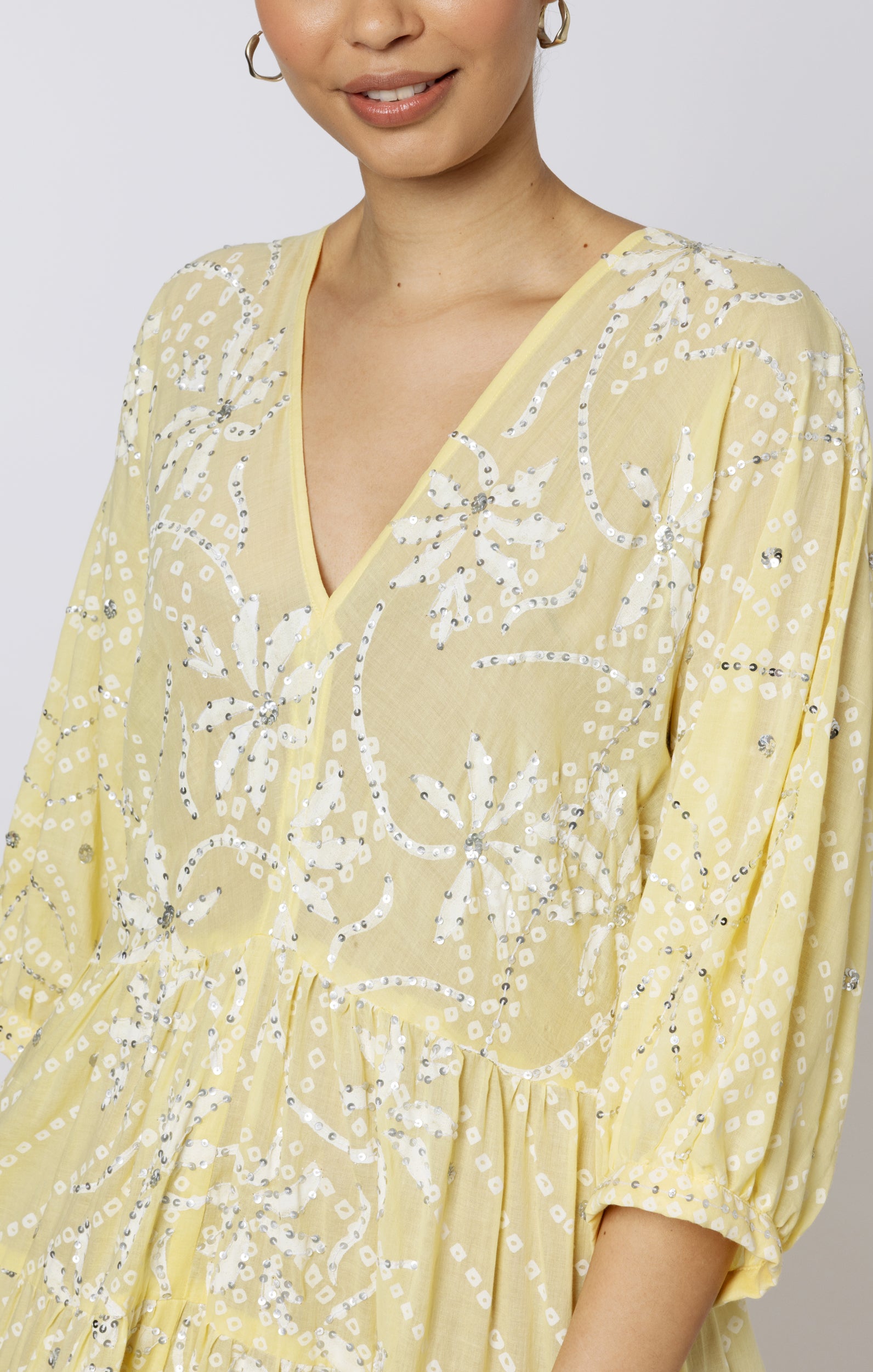 A deep V falls down the body and creates a flattering silhouette. The tiered hemline means this dress flows with every step, adding a touch of glamour to an easy dress. The unique lily print is finished with hand embroidered sequins.