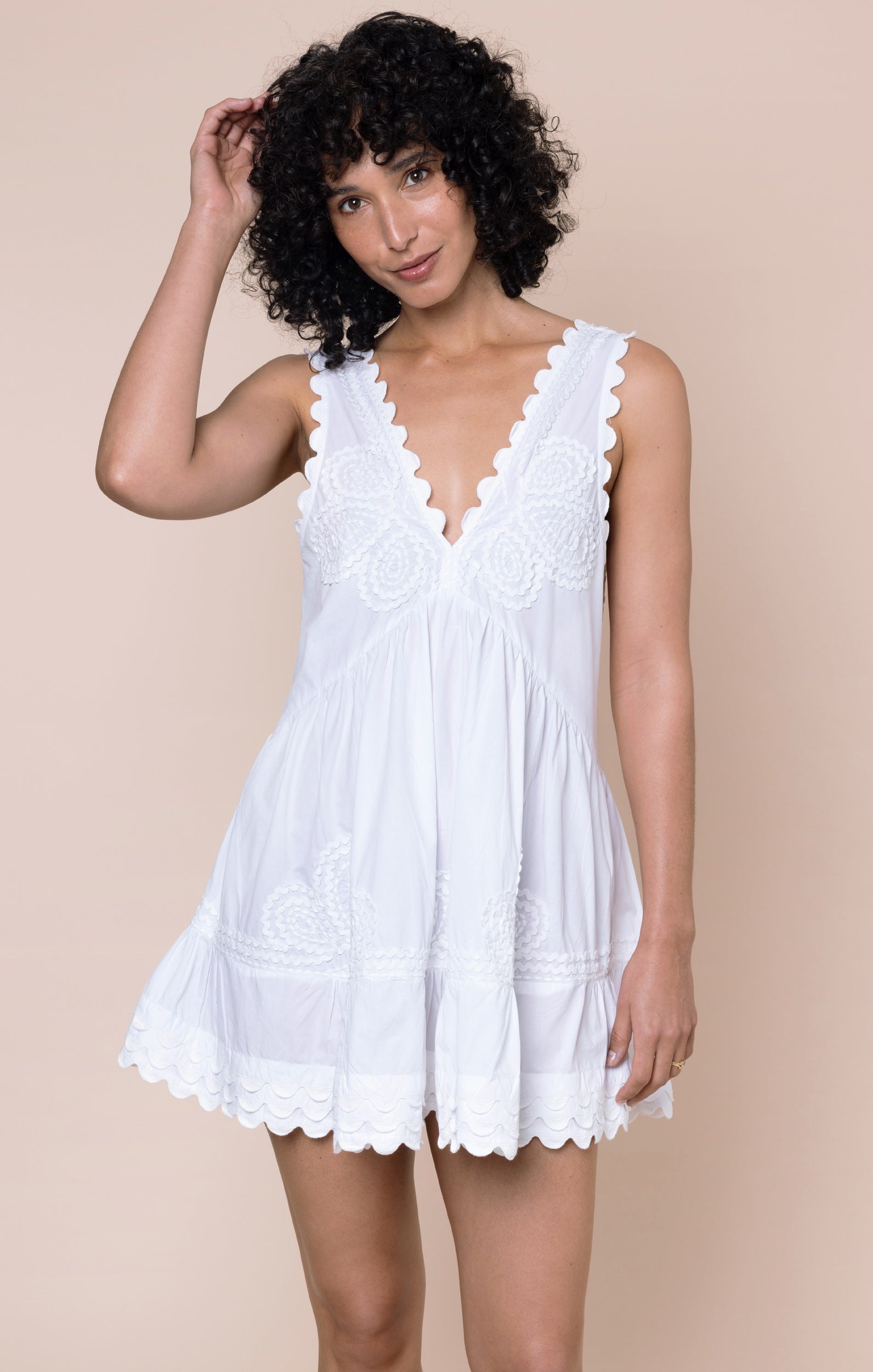 V-Back Mini Dress in Flamingo Poplin with Ric Rac Embroidery