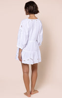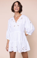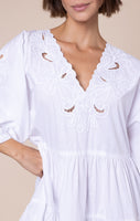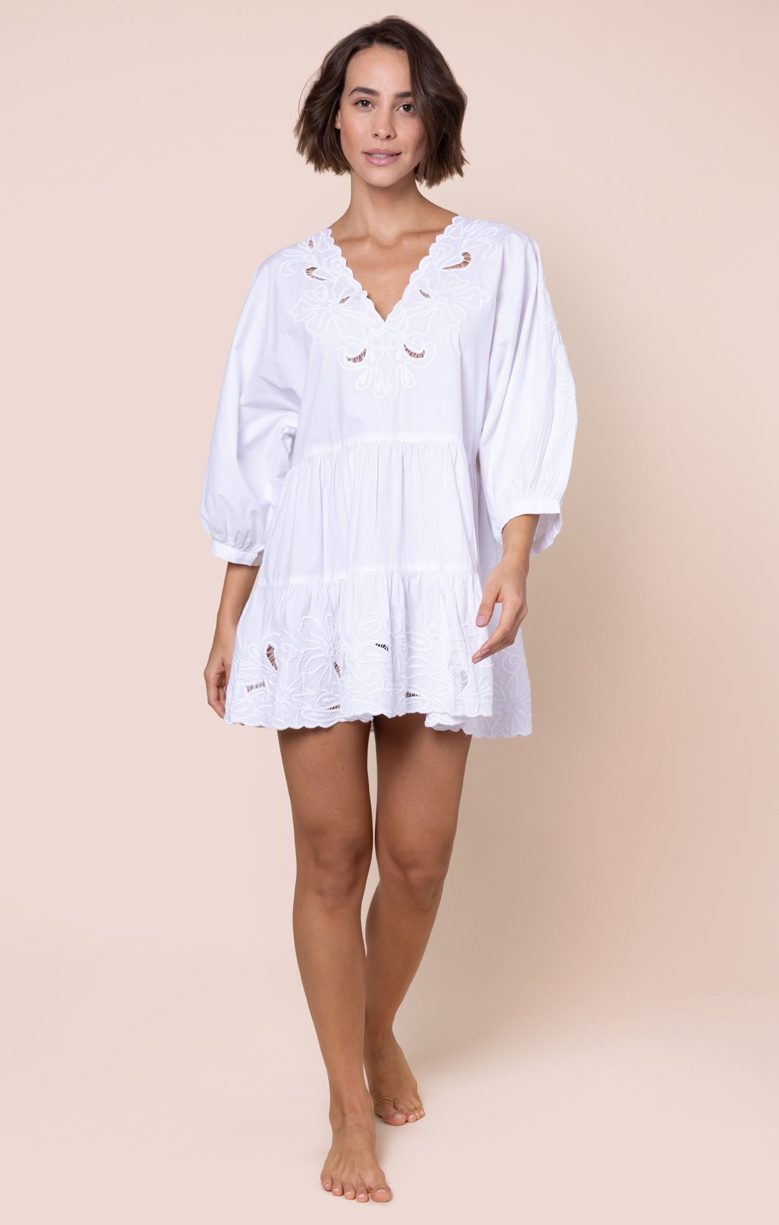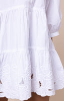 Loose Mini Dress in White Poplin with Cut Out Embroidery